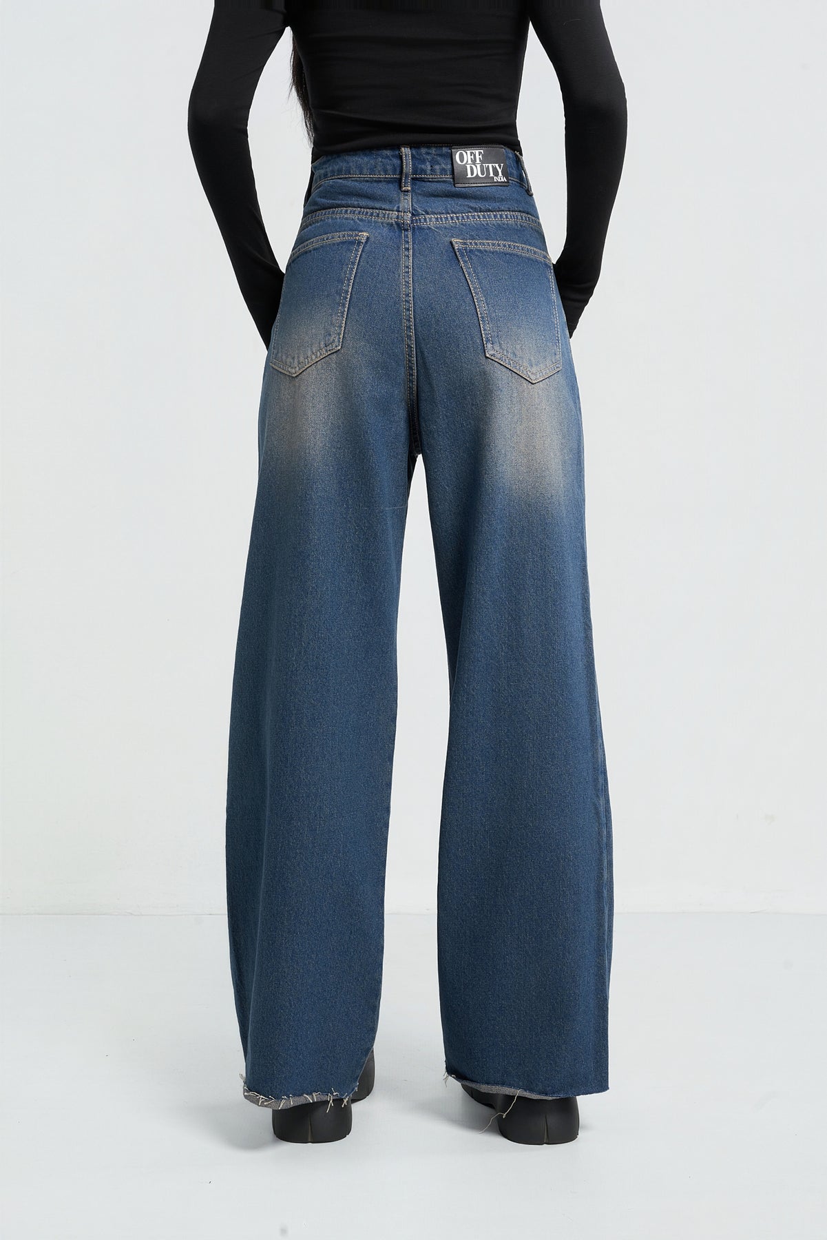A denim disruptor. These wide-leg jeans feature a standout asymmetric waistband and heavy knee distressing that channel an offbeat, street-leaning aesthetic. The rigid 12 oz fabric gives them a structured drape and authentic feel, while the 3/1 RHT weave delivers durability with every wear.