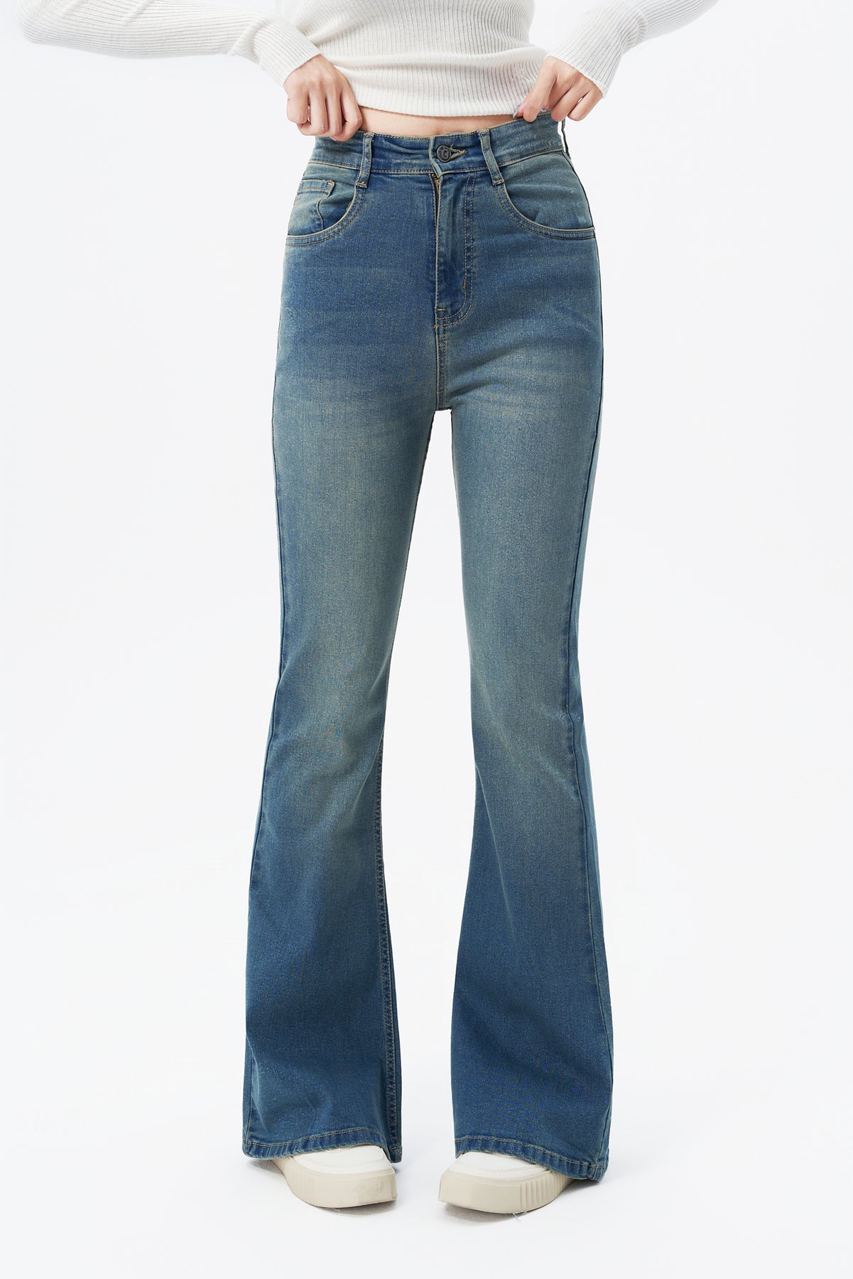 • Style: High-rise, flared leg jeans with a slim upper fit
