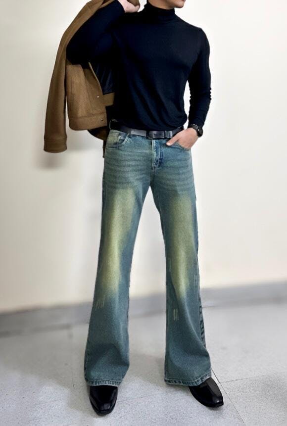 These Distressed Yellow-Tint bootcut Jeans are a bold take on streetwear denim. Designed in a laid-back relaxed fit, they feature a washed light indigo base with a yellow tint overlay and subtle distressed marks for an edgy, worn-in vibe.