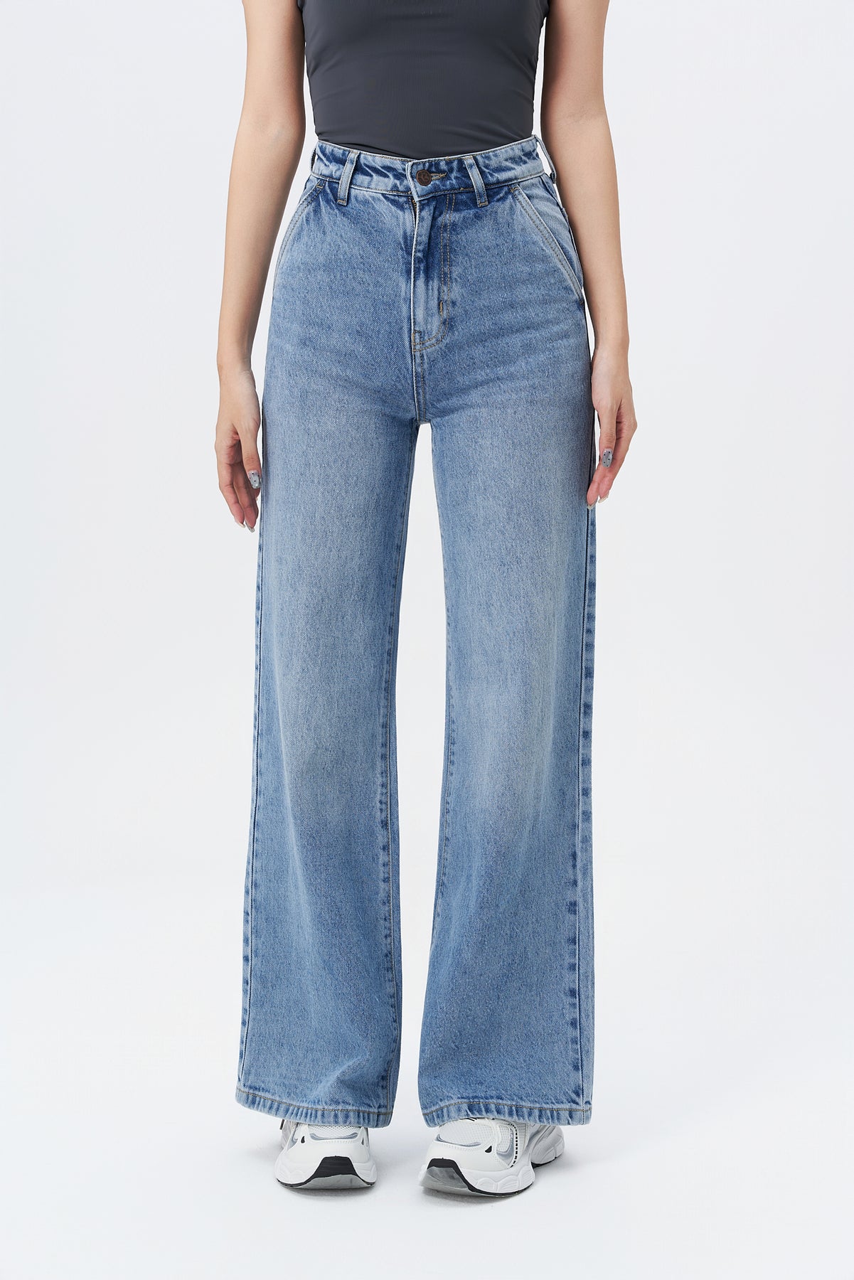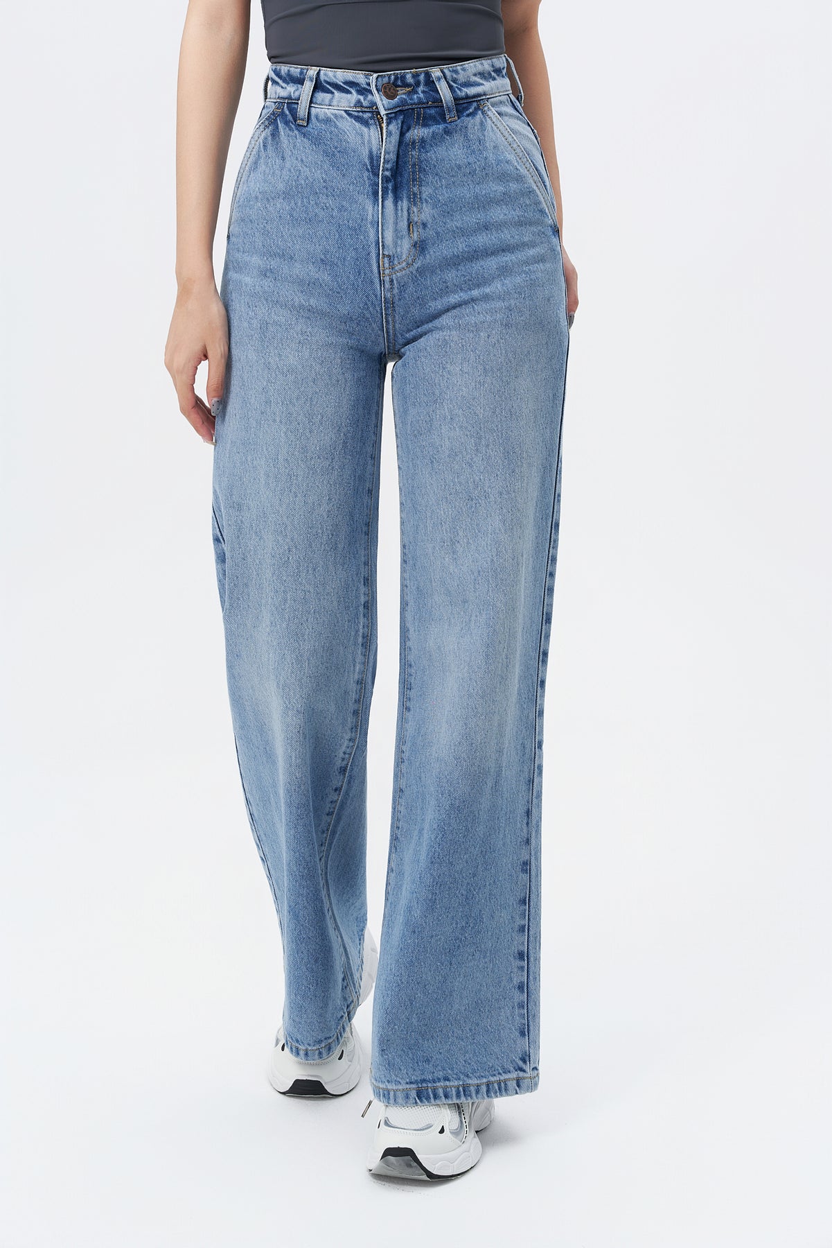 Style: High-waist, wide-leg jeans
