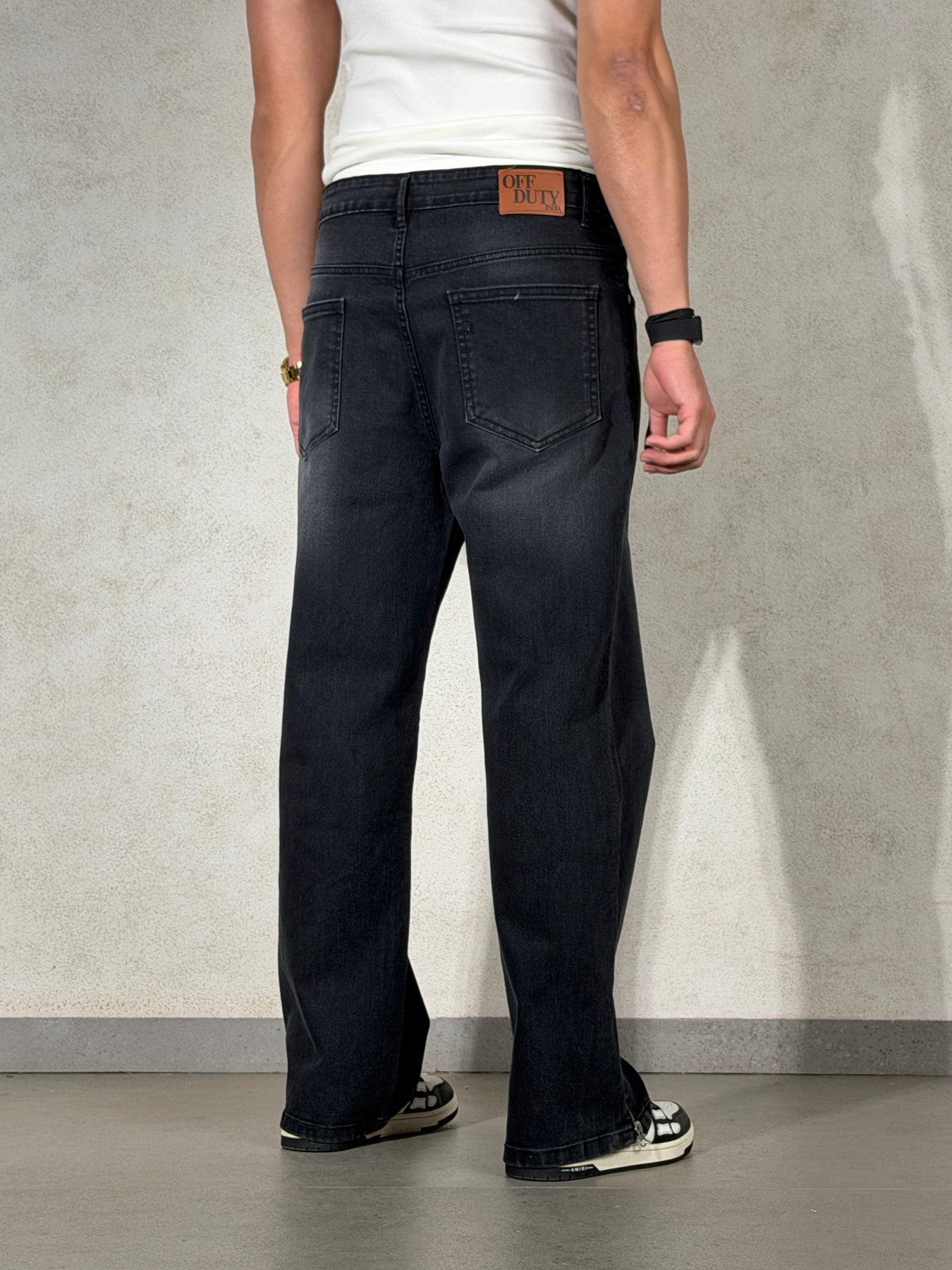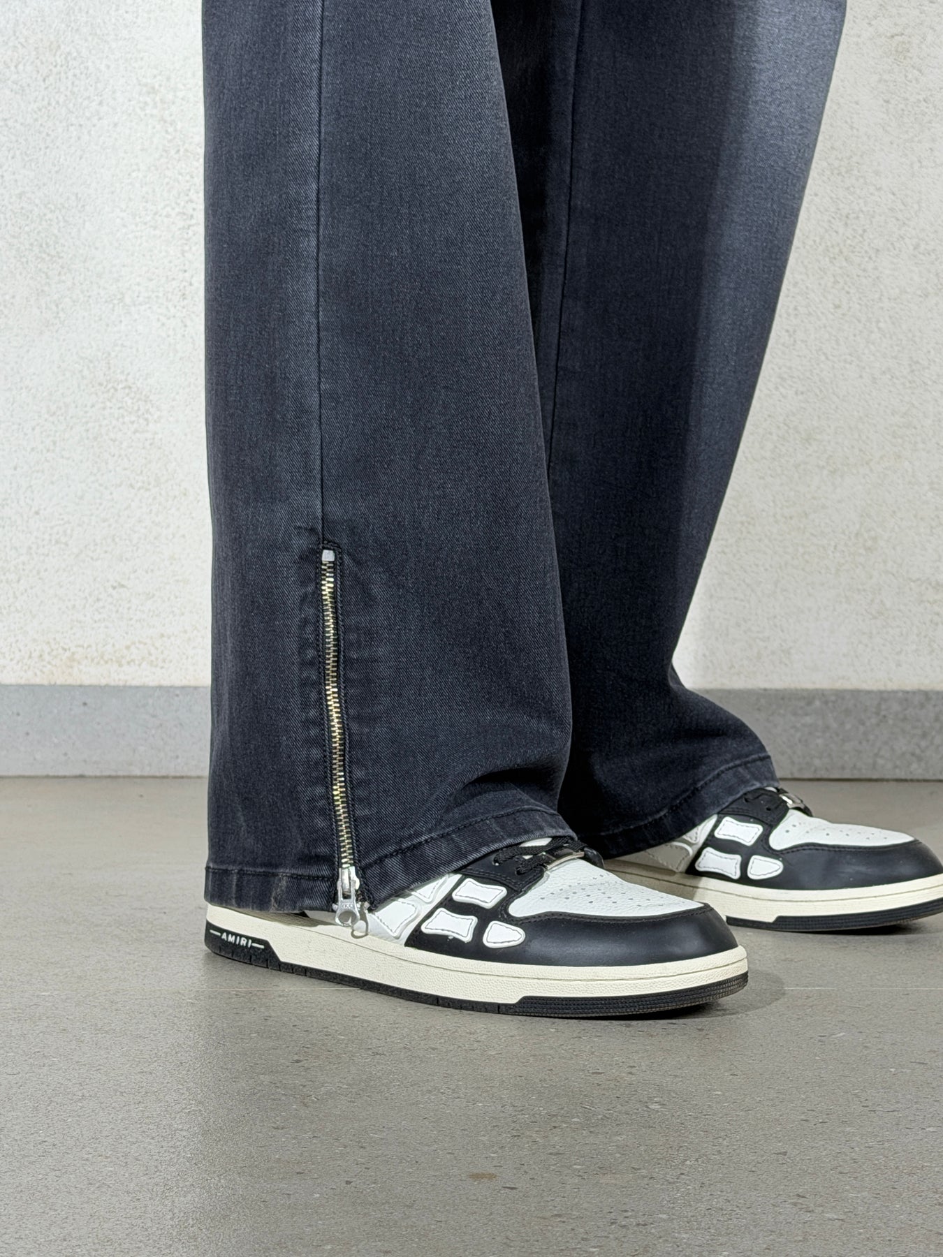 Details: Relaxed straight leg, soft thigh/knee fading, structured drape, zip-hem finish