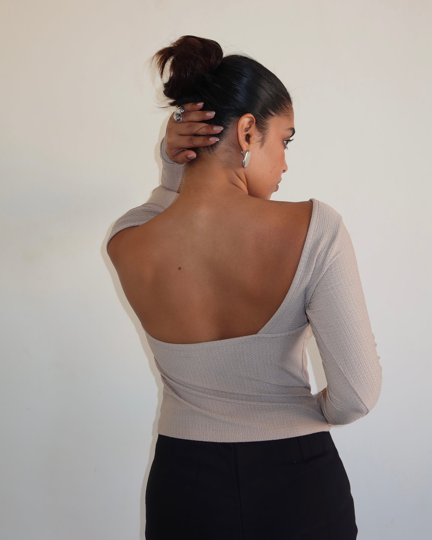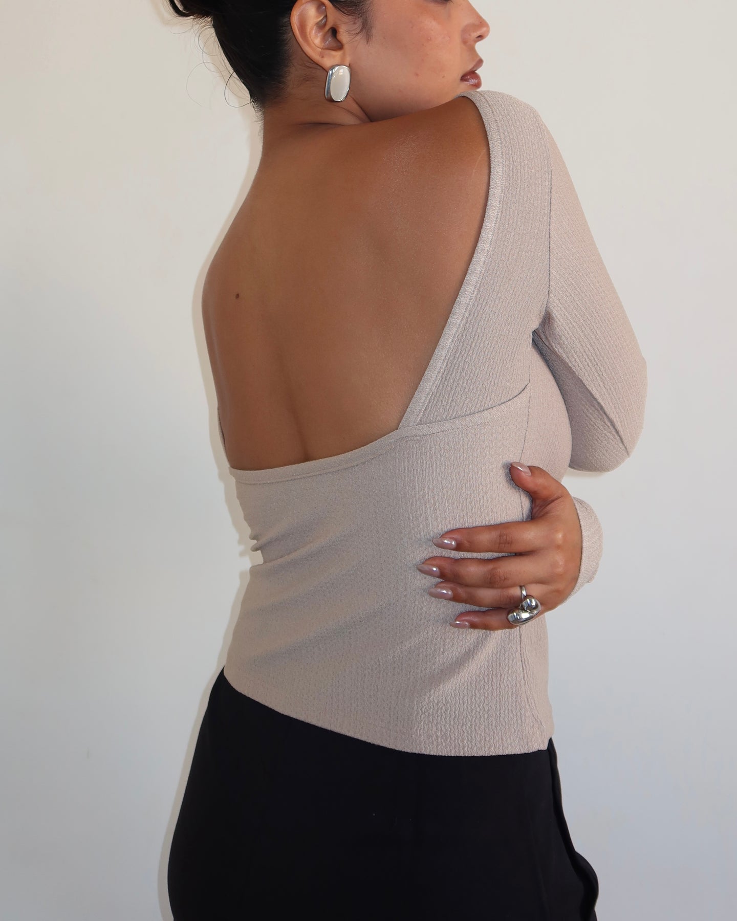 Pair it with sleek trousers or a statement skirt to highlight the open back, or layer the front under a sharp blazer for a sophisticated mix of texture and modern allure.