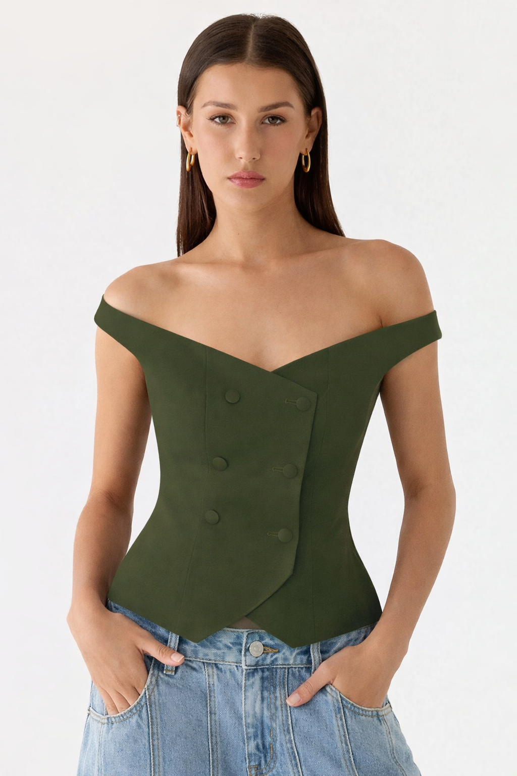 This top brings casual ease with fashion-forward flair. Featuring a cold-shoulder cut, button-down closure, and front split hem, it merges elevated tailoring with relaxed comfort. The smooth woven fabric offers a slight stretch, delivering an effortless, cool look for everyday wear.