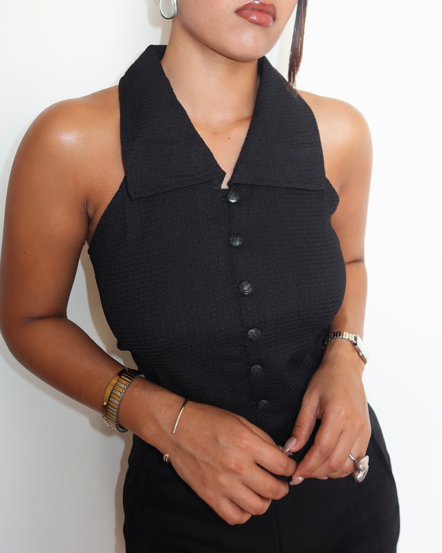 • Details: Collared Halter Neckline, Sleeveless, Front Button-Down with Fabric-Covered Buttons