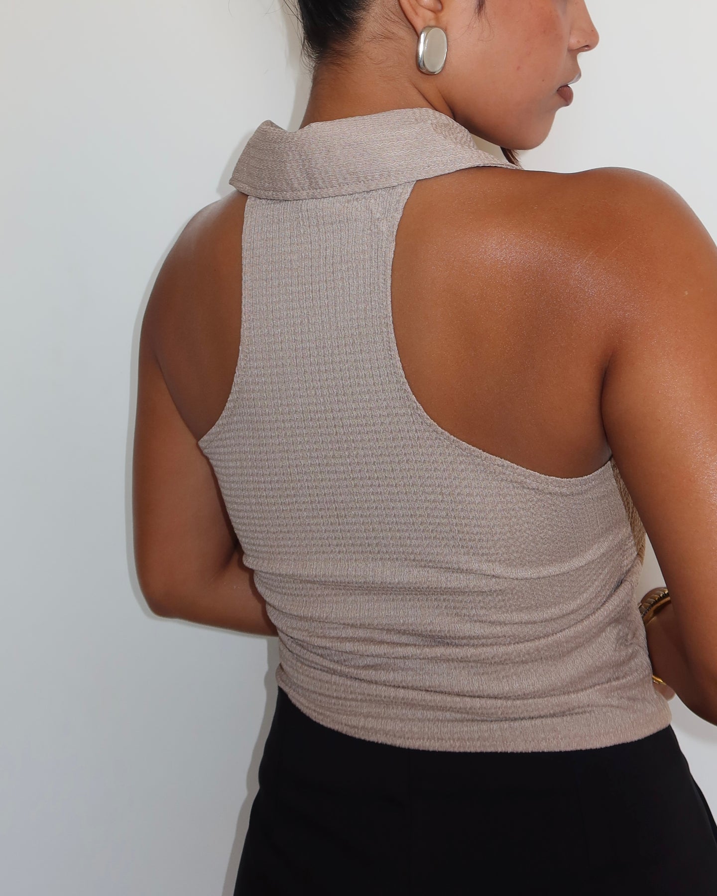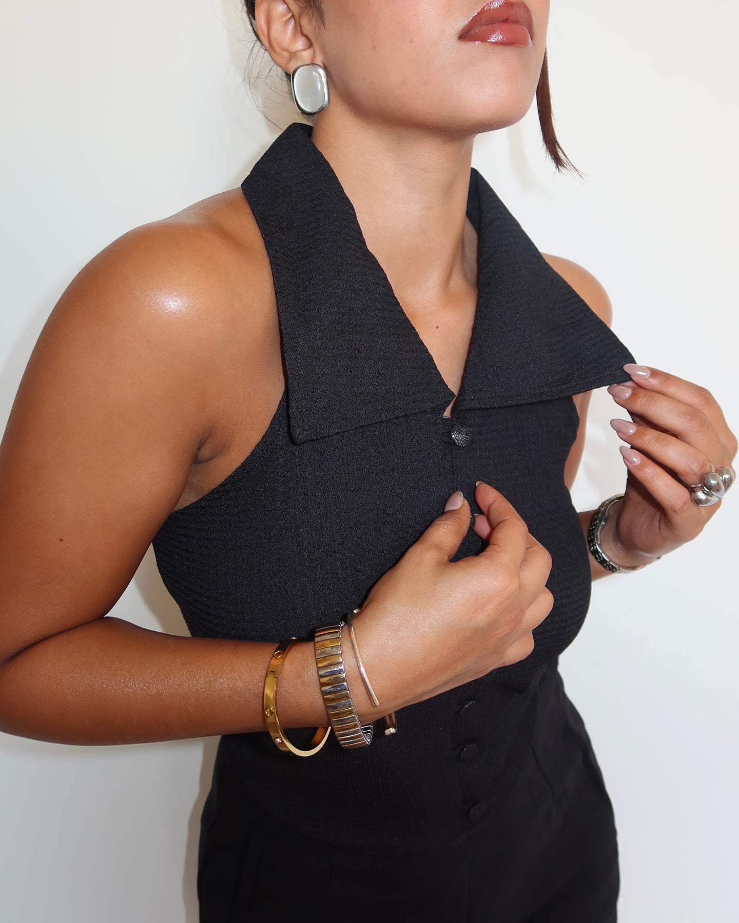 This collared halter vest brings a polished edge to contemporary tailoring. Crafted in ZIGZAGKnit Jacquard, it features a sculpted halter neckline, fitted waist, and a clean button-down front with fabric-covered buttons for a seamless finish. The knit’s subtle zigzag texture enhances its modern sophistication, while the stretch and drape offer comfort without compromising structure. Designed to contour and flatter, this vest transitions effortlessly from sharp daytime looks to elevated evening styling.