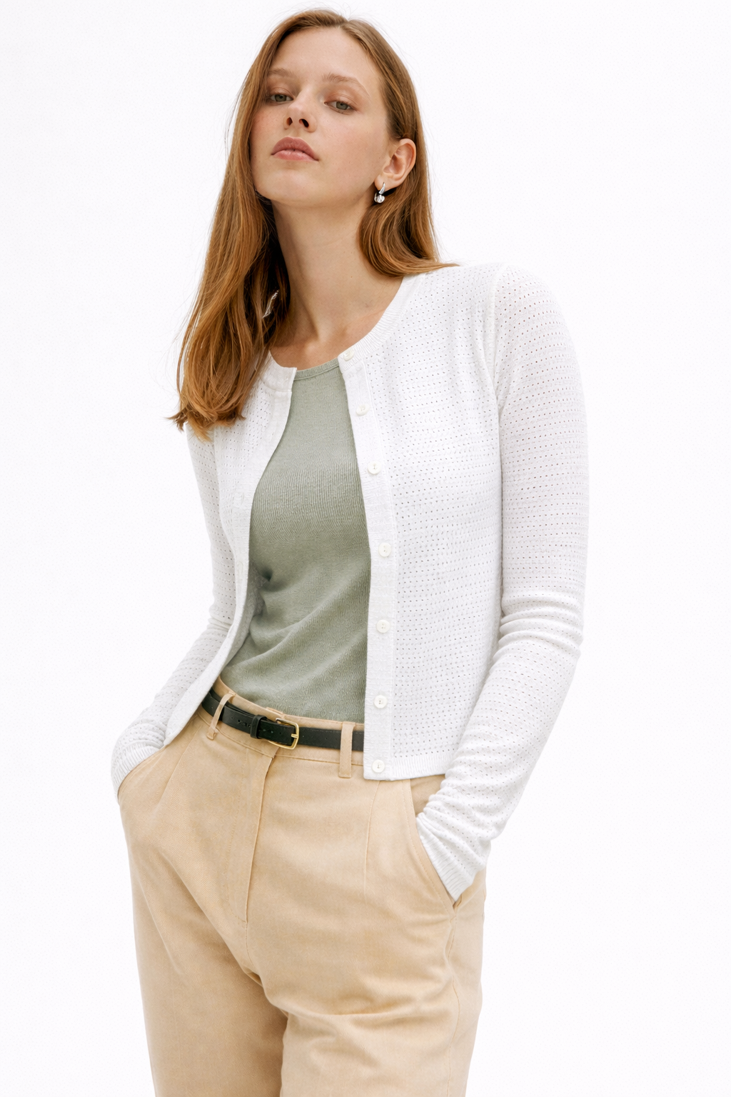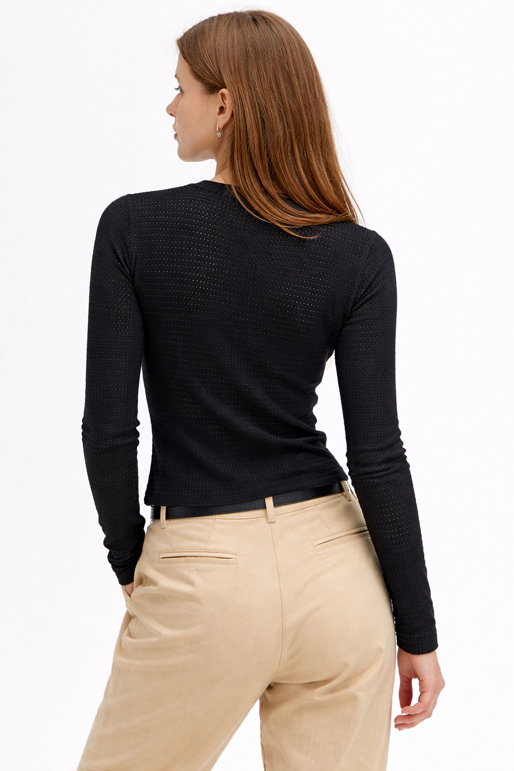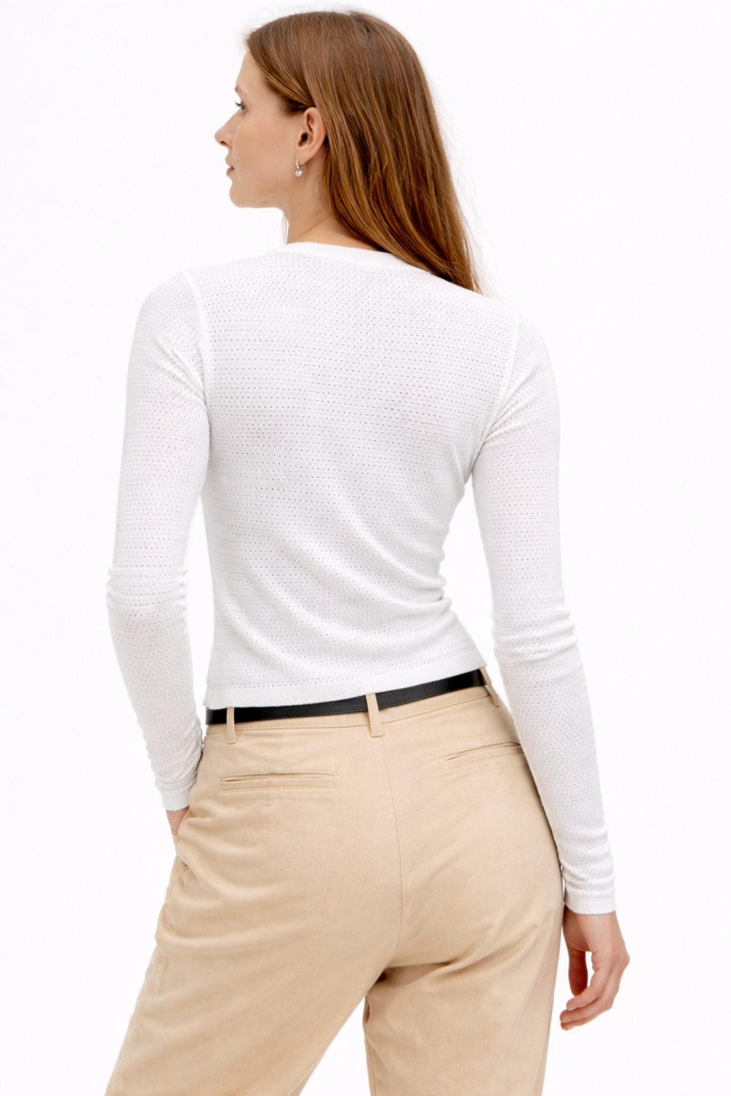 This full-sleeve fitted top is cut from Chikan Kari Jacquard Knit, balancing structure with stretch for a sleek, body-skimming fit. Featuring a clean button-front closure and subtle textural detailing, it blends everyday comfort with elevated design. The fabric’s flowy drape and refined surface interest make it versatile enough to wear solo or layered, effortlessly moving between day and night.