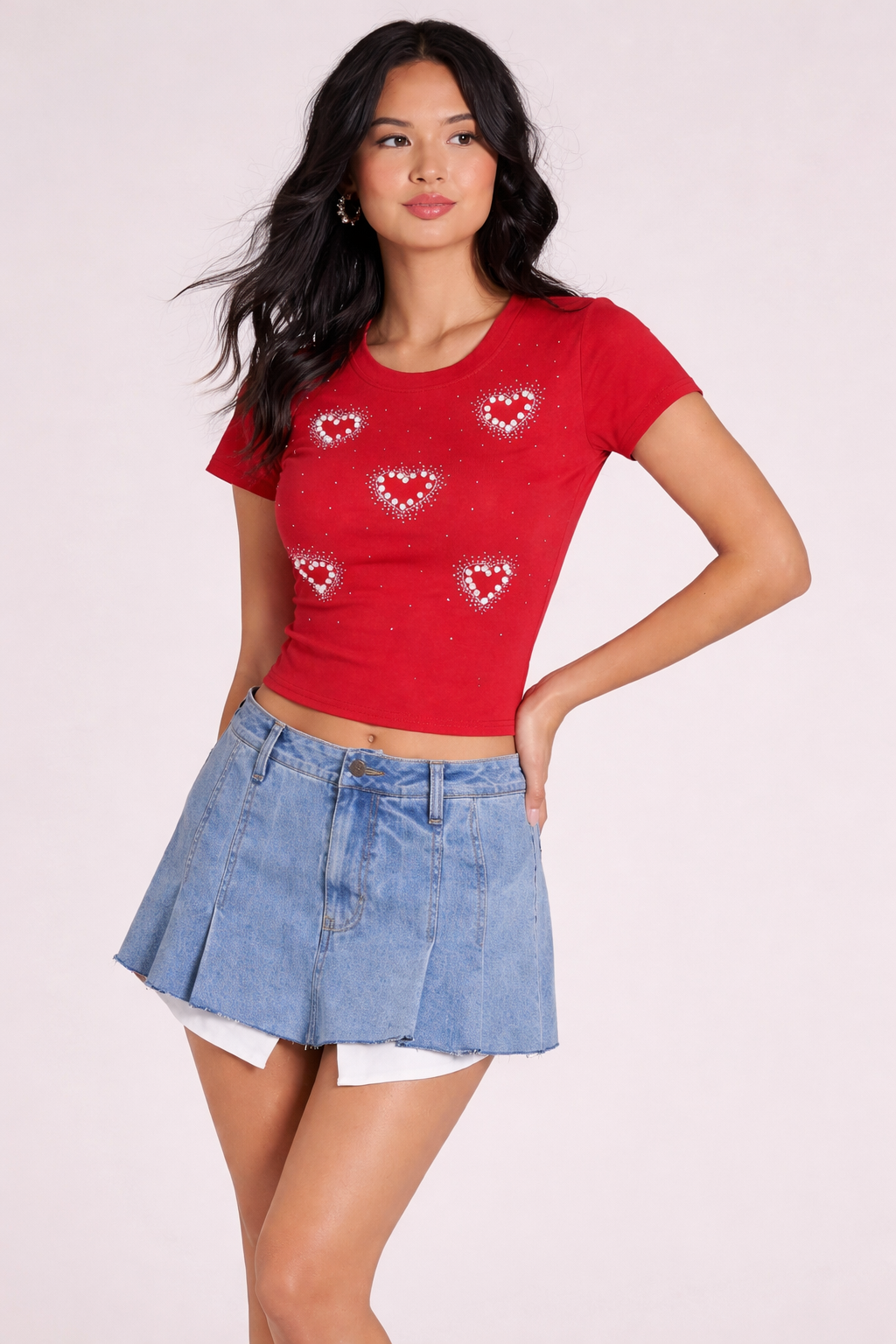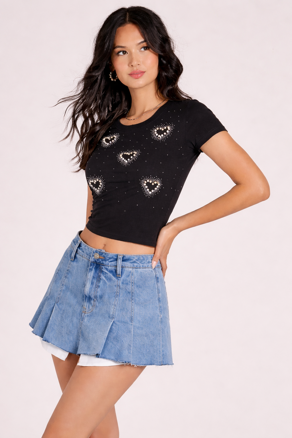 A cute statement staple, this baby tee features scattered heart motifs with pearl-like embellishment detailing for a sparkly, romantic vibe. Designed with a snug, slightly cropped fit and a classic crew neckline, it’s perfect for dressing up your everyday denim or pairing with skirts for a night-out look.