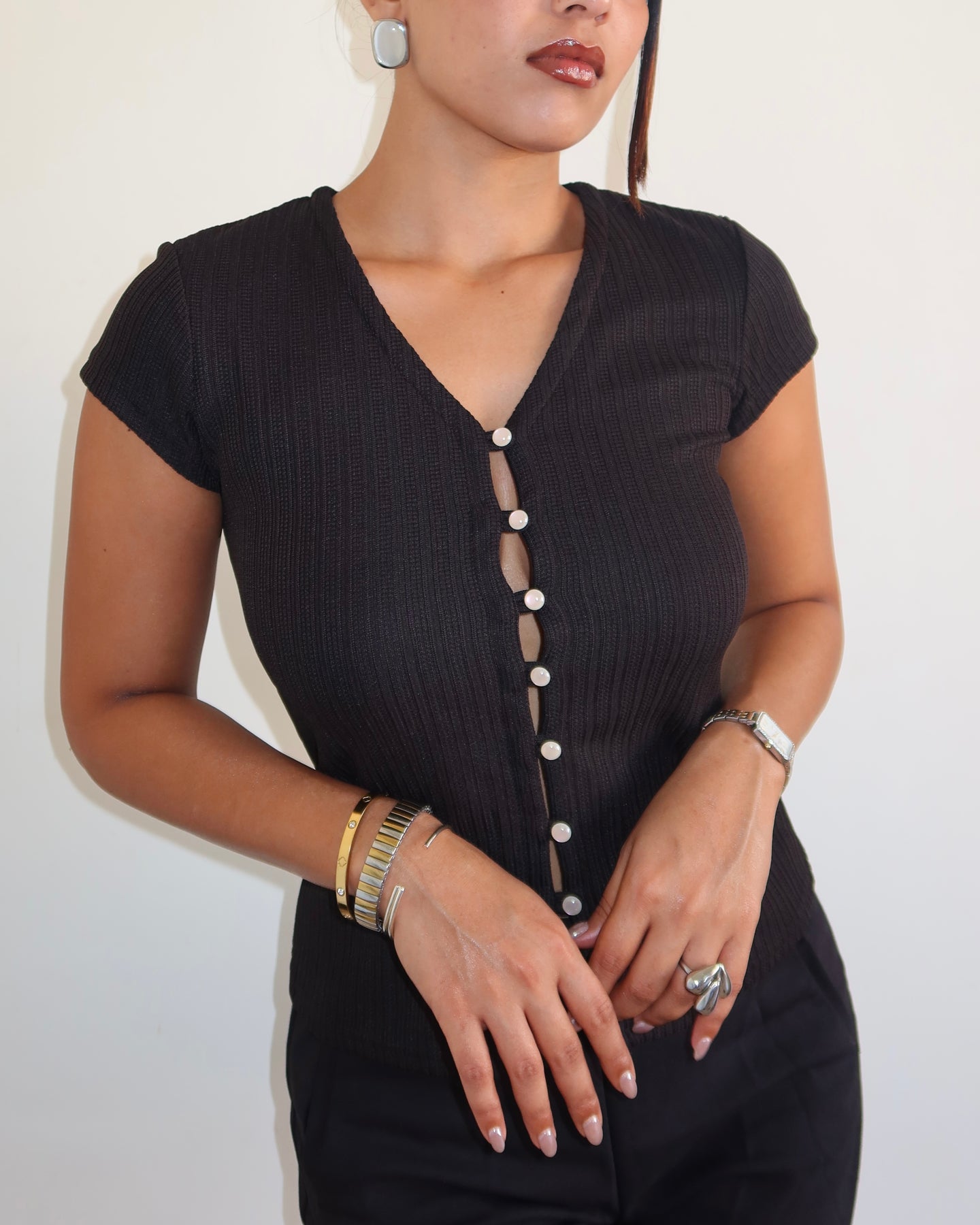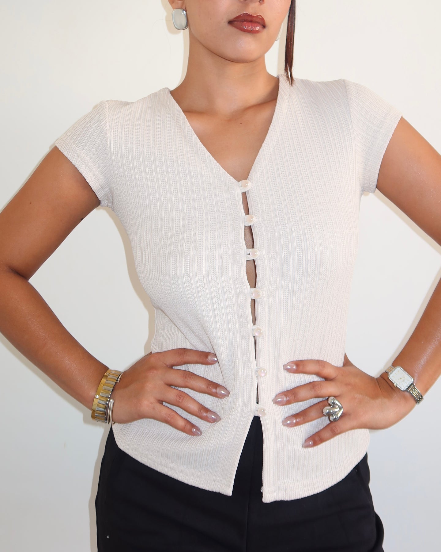 The Pearlette Knit Cardigan Top elevates everyday dressing with its soft, sculpted knit and refined femininity. Designed with a flattering V-neckline and a pearl-button front, it brings a polished twist to a classic cardigan silhouette. The pearled knit texture adds depth, while the stretch-infused fabric ensures smooth comfort, ease of movement, and a clean, flattering fit.