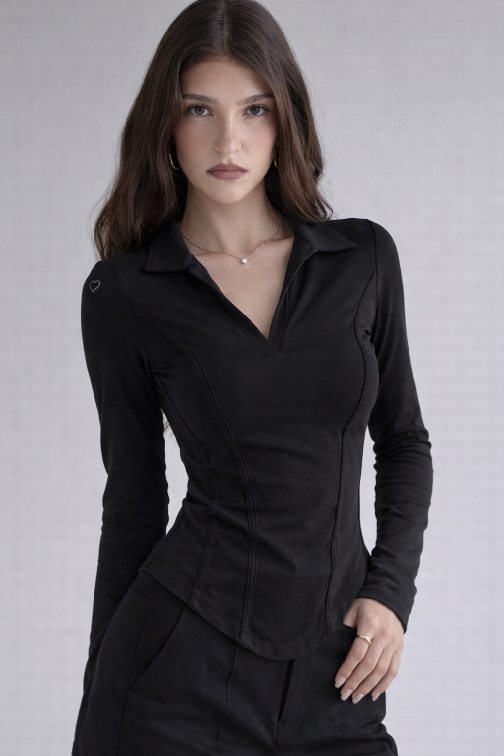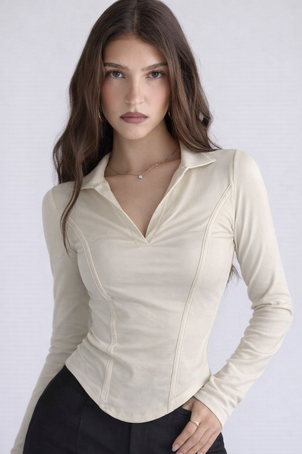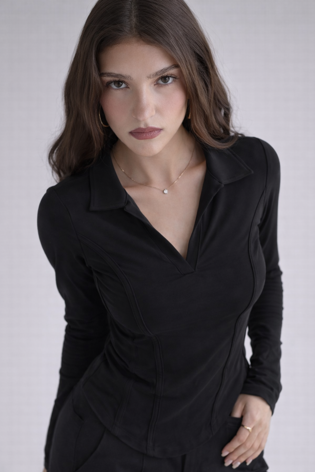 A sleek, elevated essential, this collared top features a sharp V-neckline with a structured collar and princess seam detailing that cinches the waist for a sculpted fit. Designed in a soft stretch fabric with full sleeves, it’s perfect for dressing up or down — pair it with tailored pants, denim, or a mini skirt for a clean, confident look.