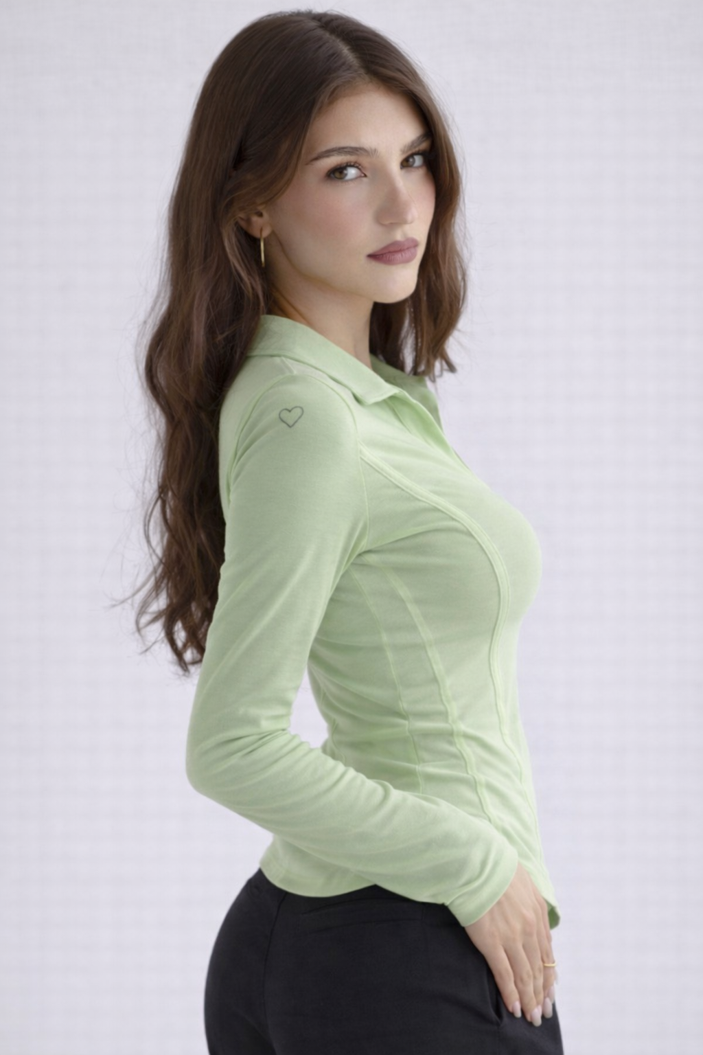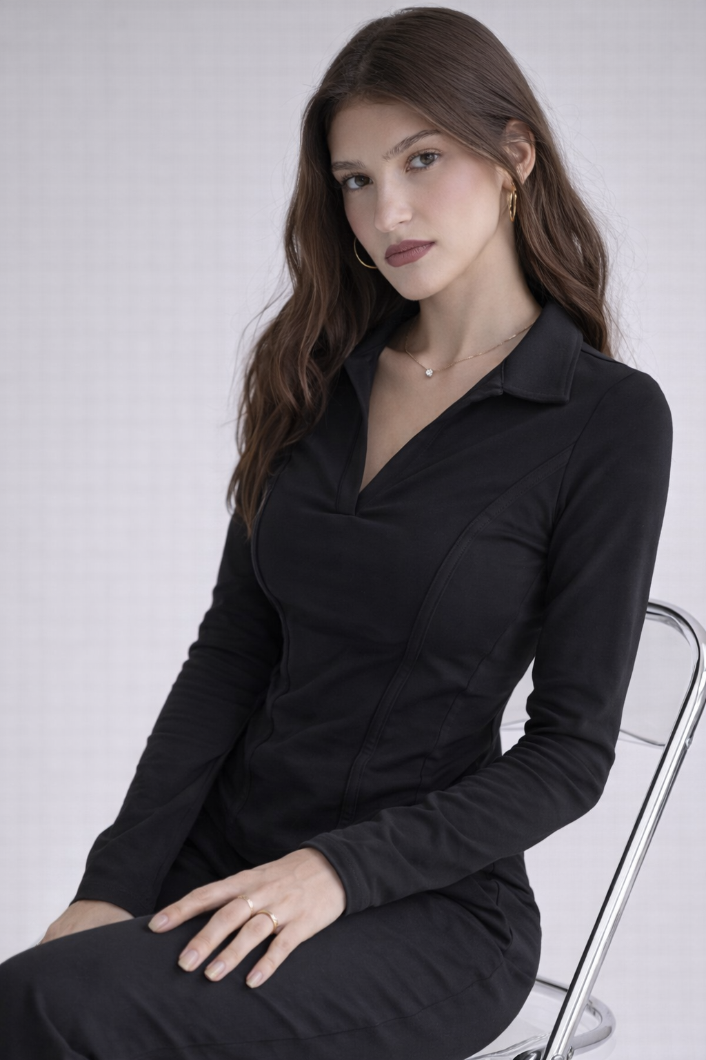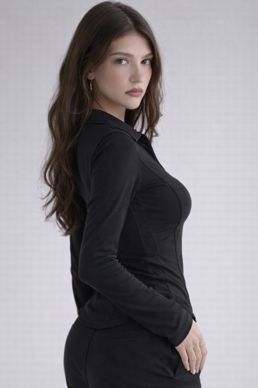 A sleek, elevated essential, this collared top features a sharp V-neckline with a structured collar and princess seam detailing that cinches the waist for a sculpted fit. Designed in a soft stretch fabric with full sleeves, it’s perfect for dressing up or down — pair it with tailored pants, denim, or a mini skirt for a clean, confident look.