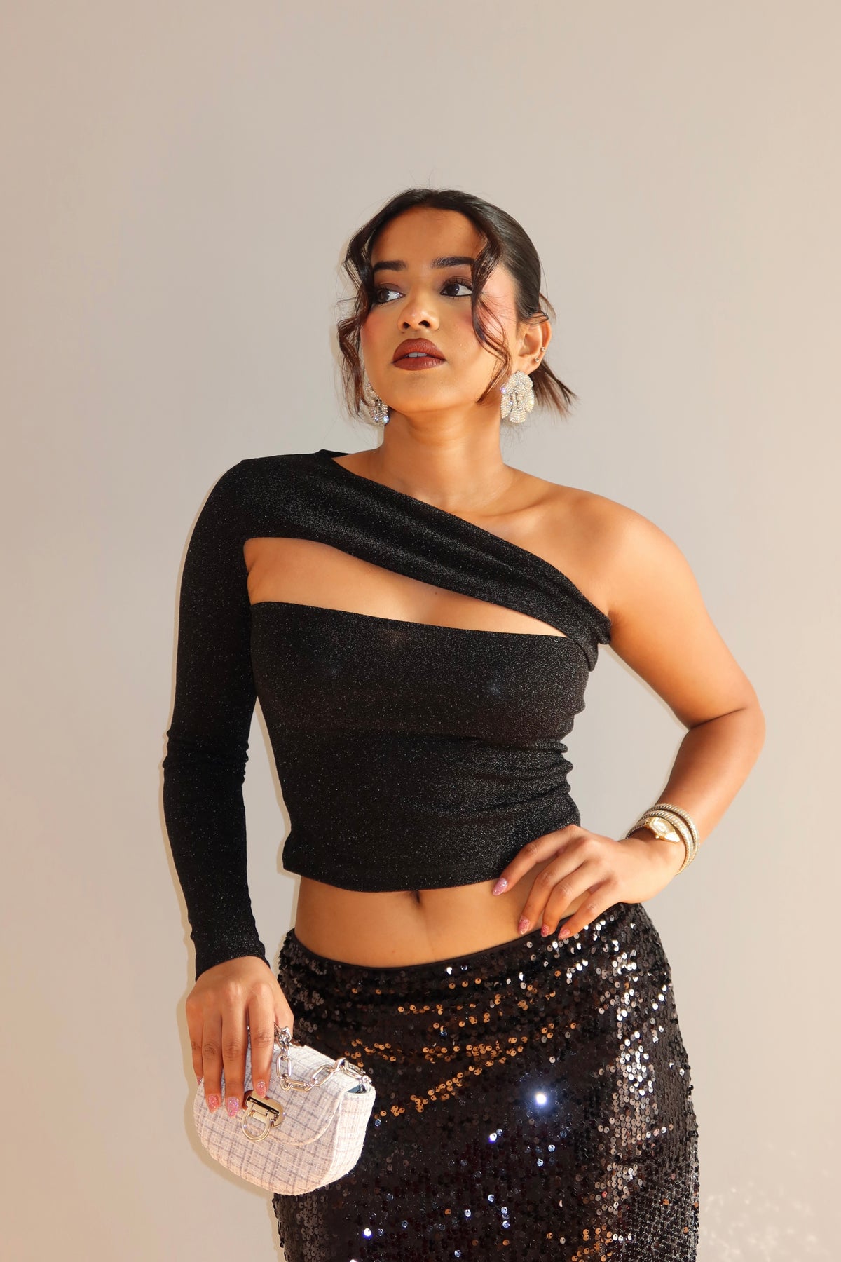 Make a statement with the Sparkline Off-Shoulder Top, where asymmetry meets subtle shimmer. Designed with one full sleeve and a single off-shoulder cut, it creates a modern, edgy silhouette while maintaining elegance. Crafted from lightweight, stretch-infused fabric, it drapes comfortably and moves with ease. The soft glittered finish adds a delicate sparkle, perfect for both daytime glam and evening allure.