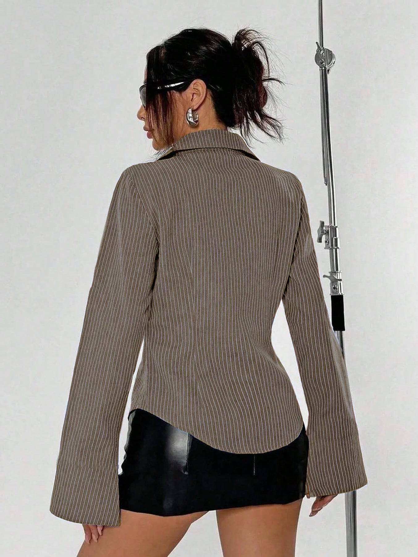 This fitted striped shirt redefines structure with a hint of softness. Crafted with precise tailoring and statement bell sleeves, it merges classic sophistication with bold edge. The colored and white stripes added playful yet polished touch, making it a versatile piece for both day and night looks.