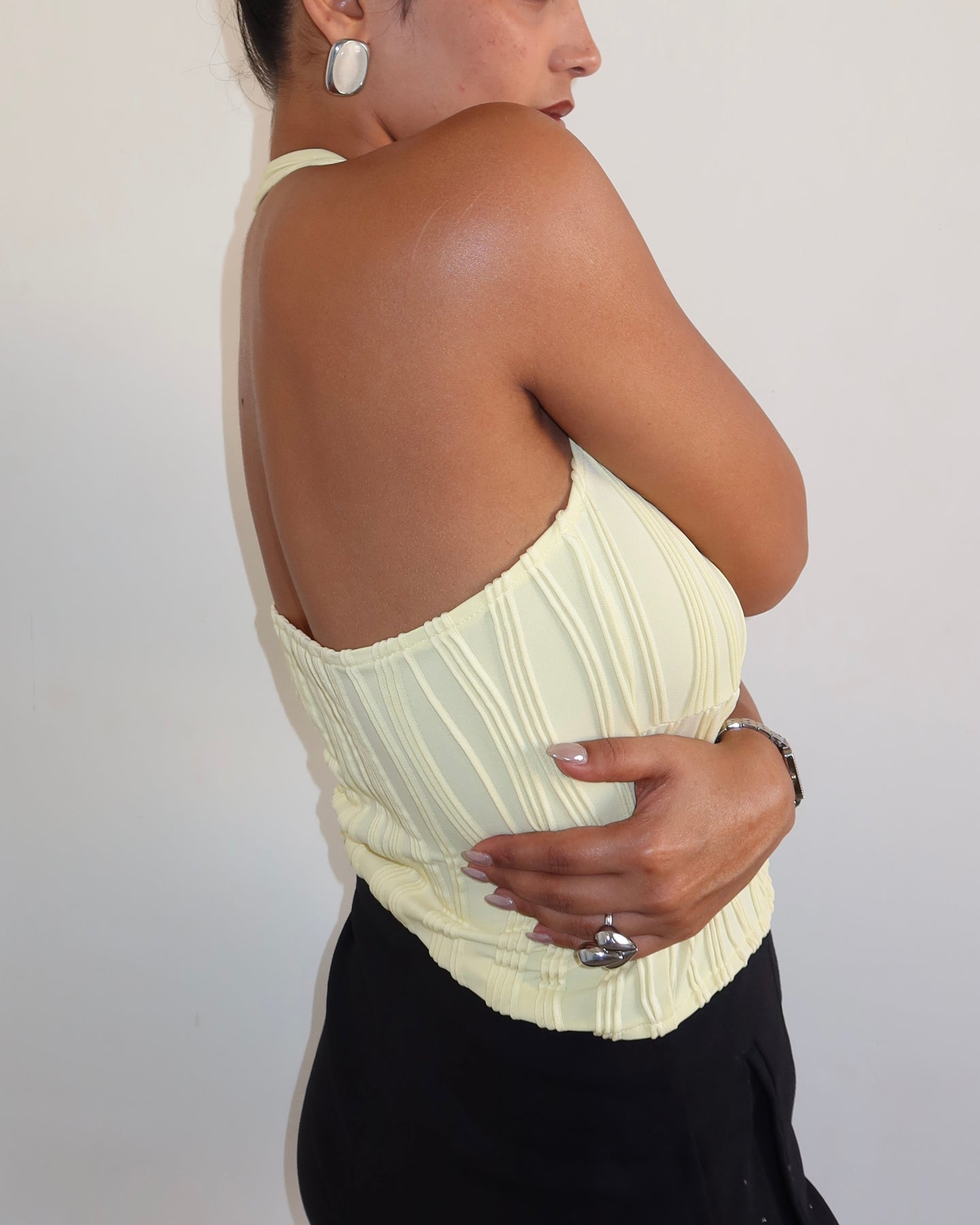 This backless halter top is crafted from KnitJacquard, adding textured depth to a sleek silhouette. Designed with a plunging neckline, button-down front, and an open back, it balances bold structure with fluid ease. The stretch-infused jacquard knit enhances comfort while maintaining shape, making it a standout piece for statement dressing — day or night.