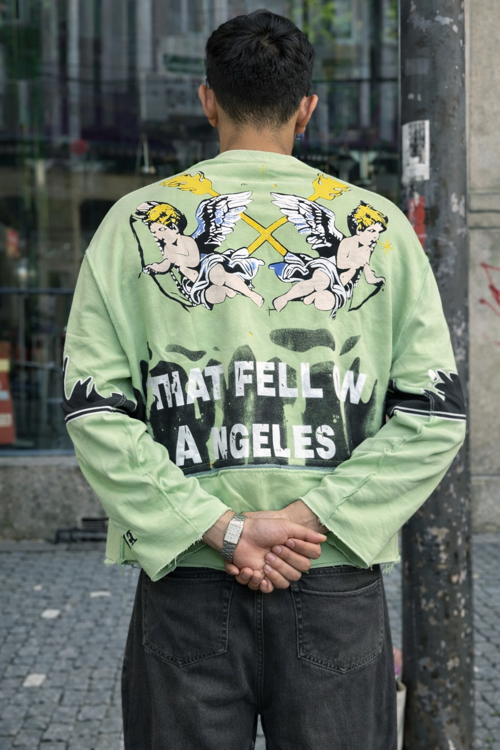 • Style: Artistic streetwear, statement graphic, layered aesthetic