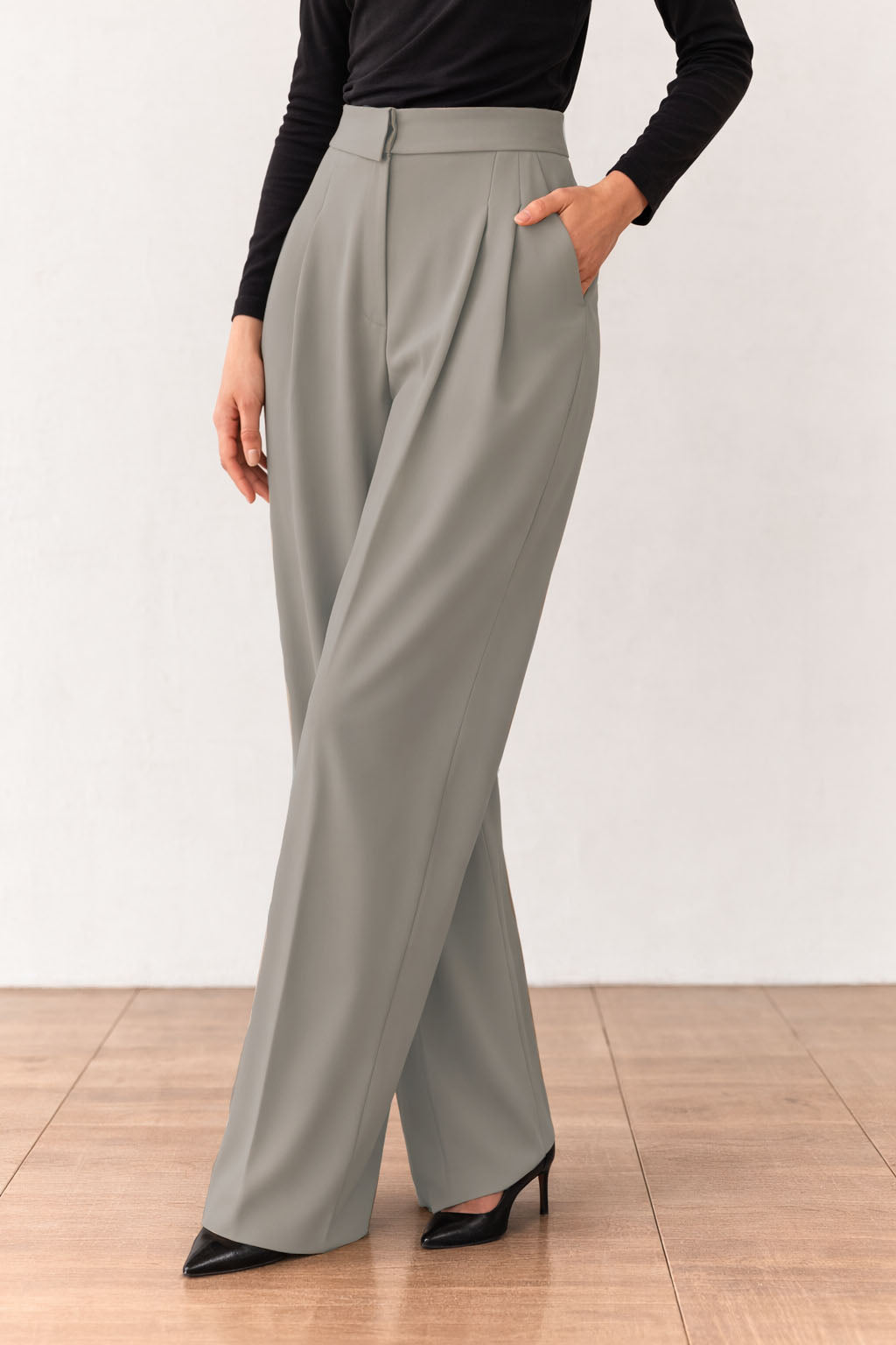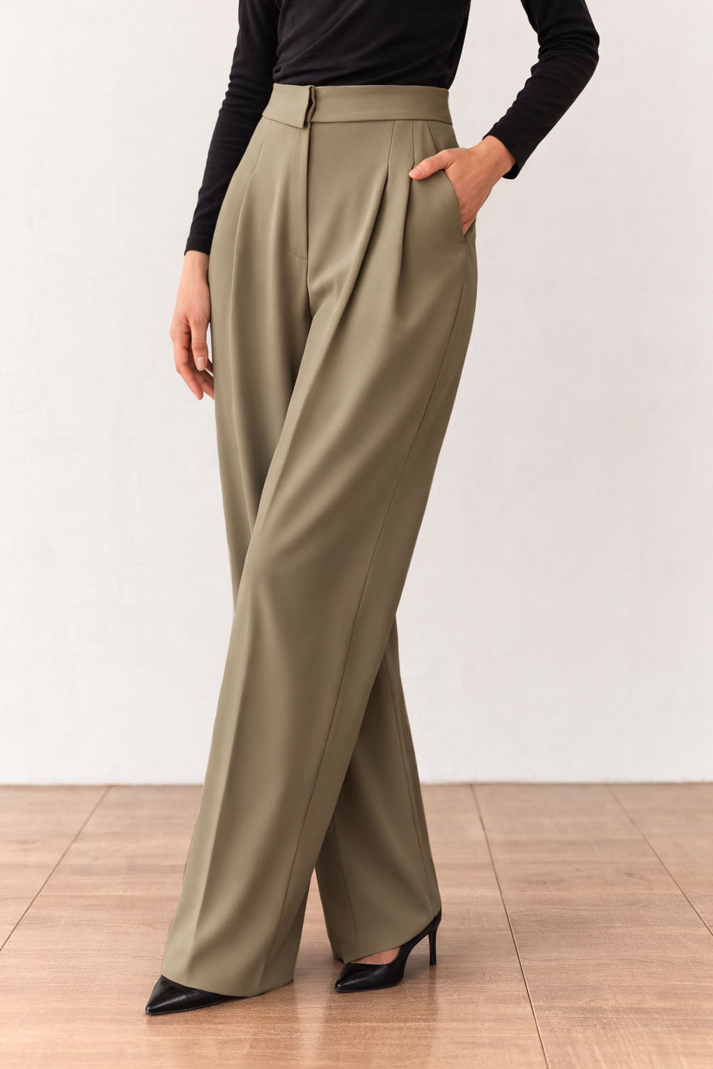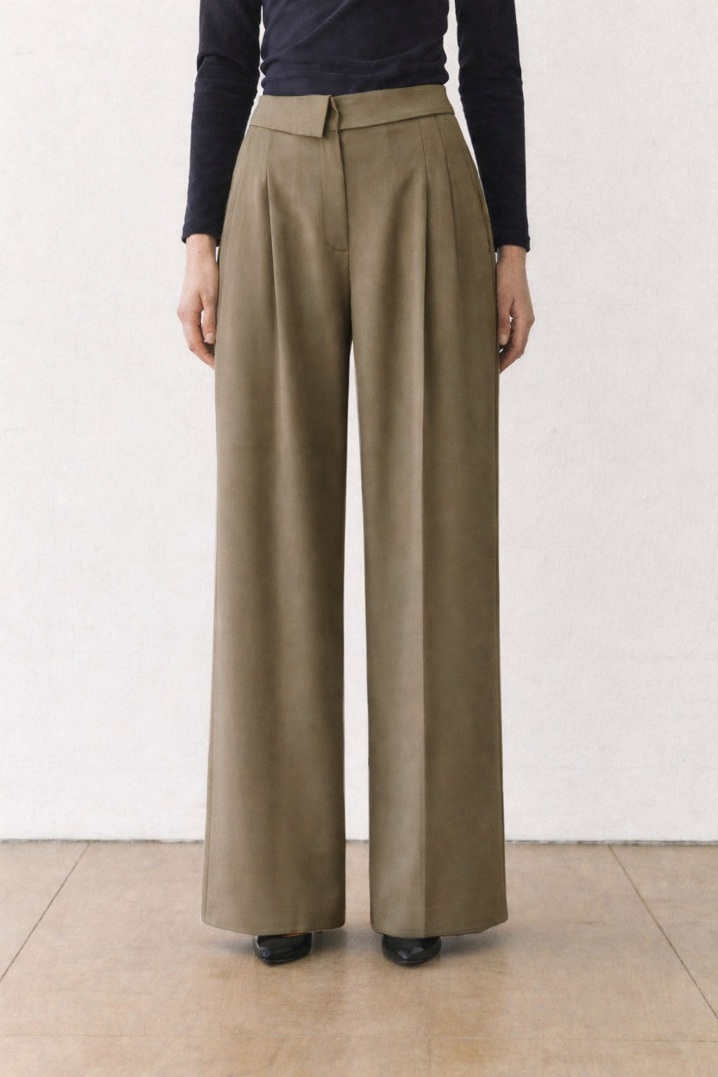 * Details: Clean collar waistband, front pleats, side pockets, wide hem
