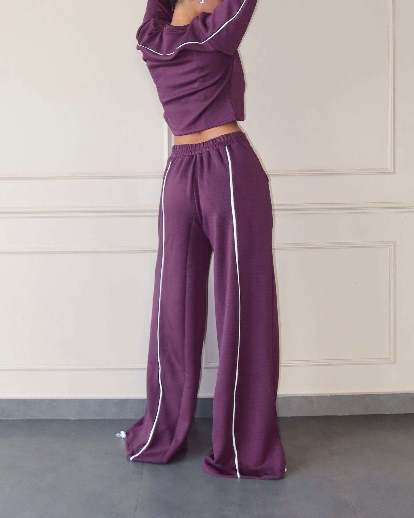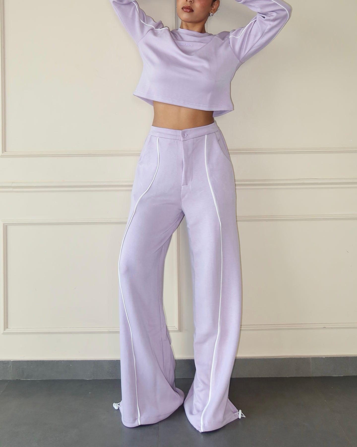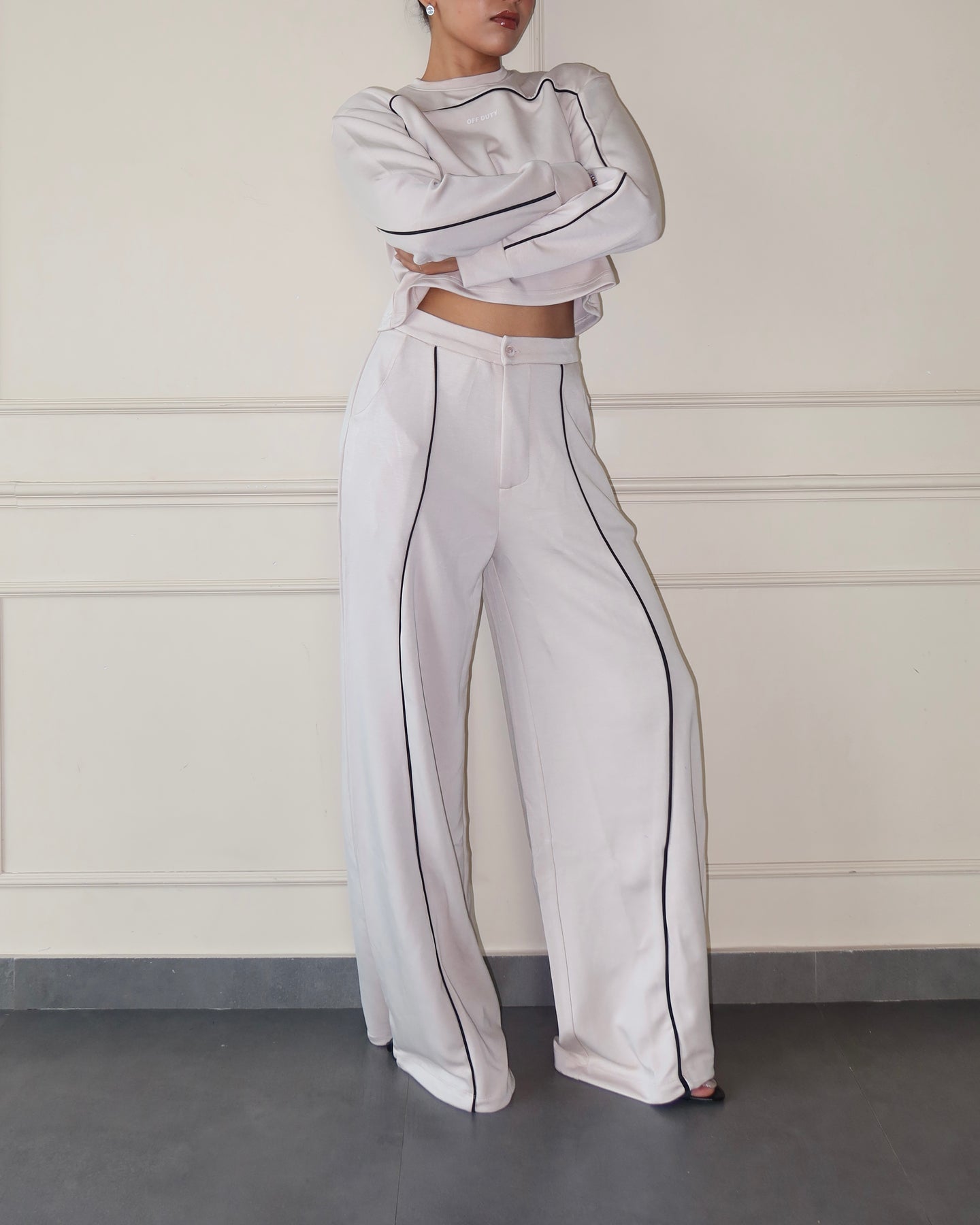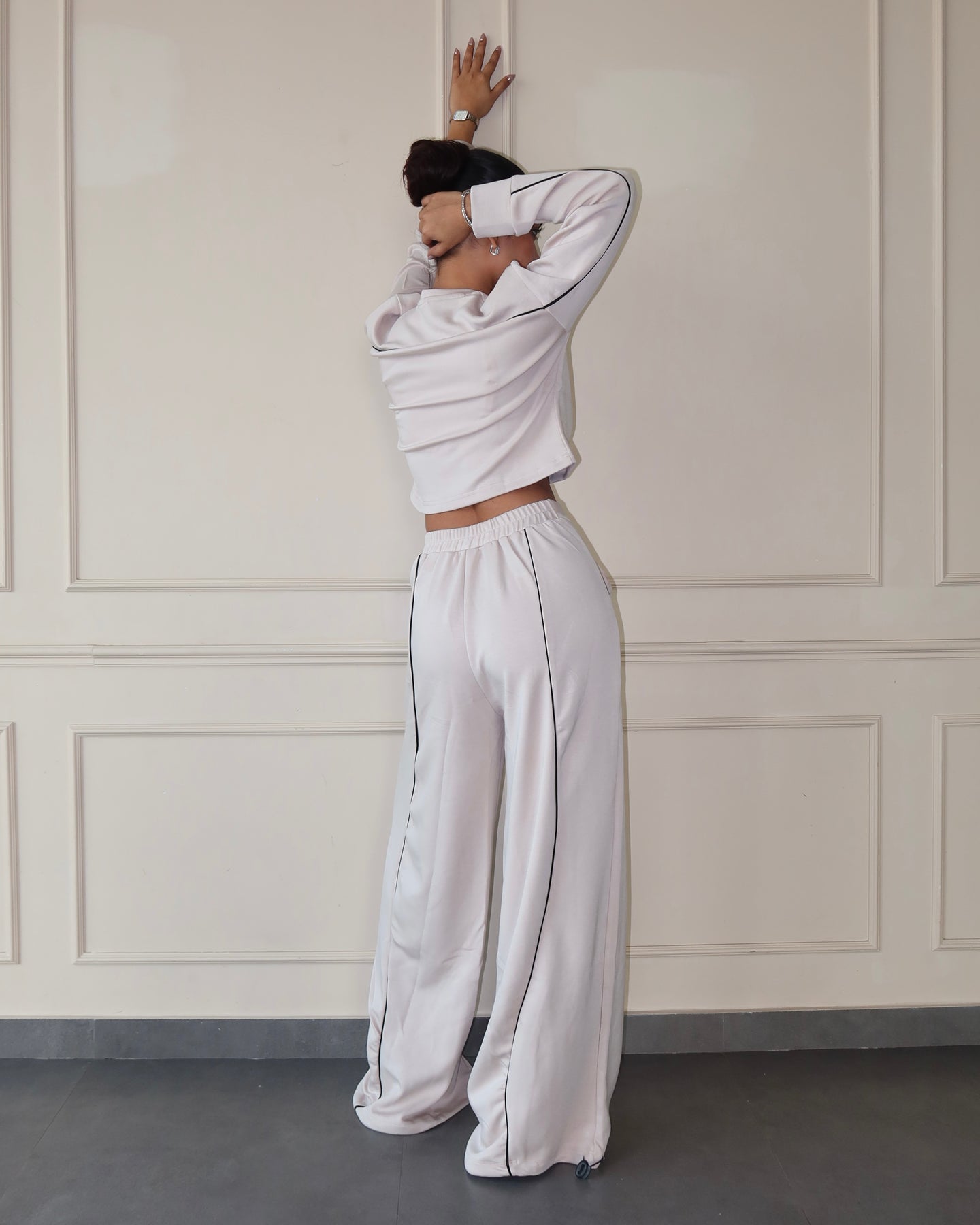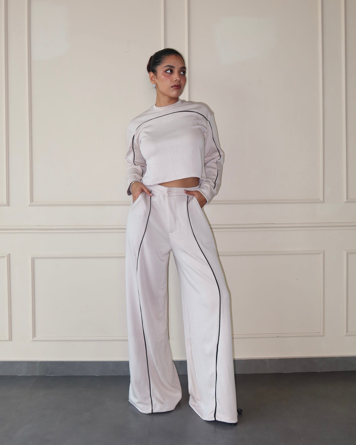 The wide-leg joggers feature cloud-contrast paneling, subtle piping, an elastic waistband, and adjustable drawstring hems for a customizable silhouette. The relaxed drop-shoulder sweatshirt mirrors the same sleek aesthetic with contrast piping and self-fabric neck and cuffs for a clean, minimal finish.
