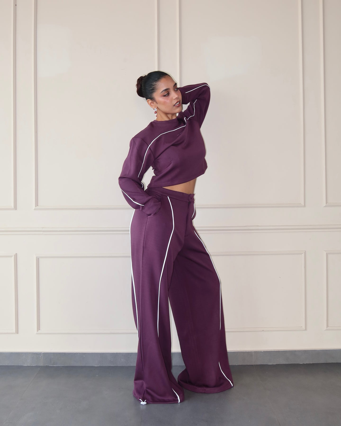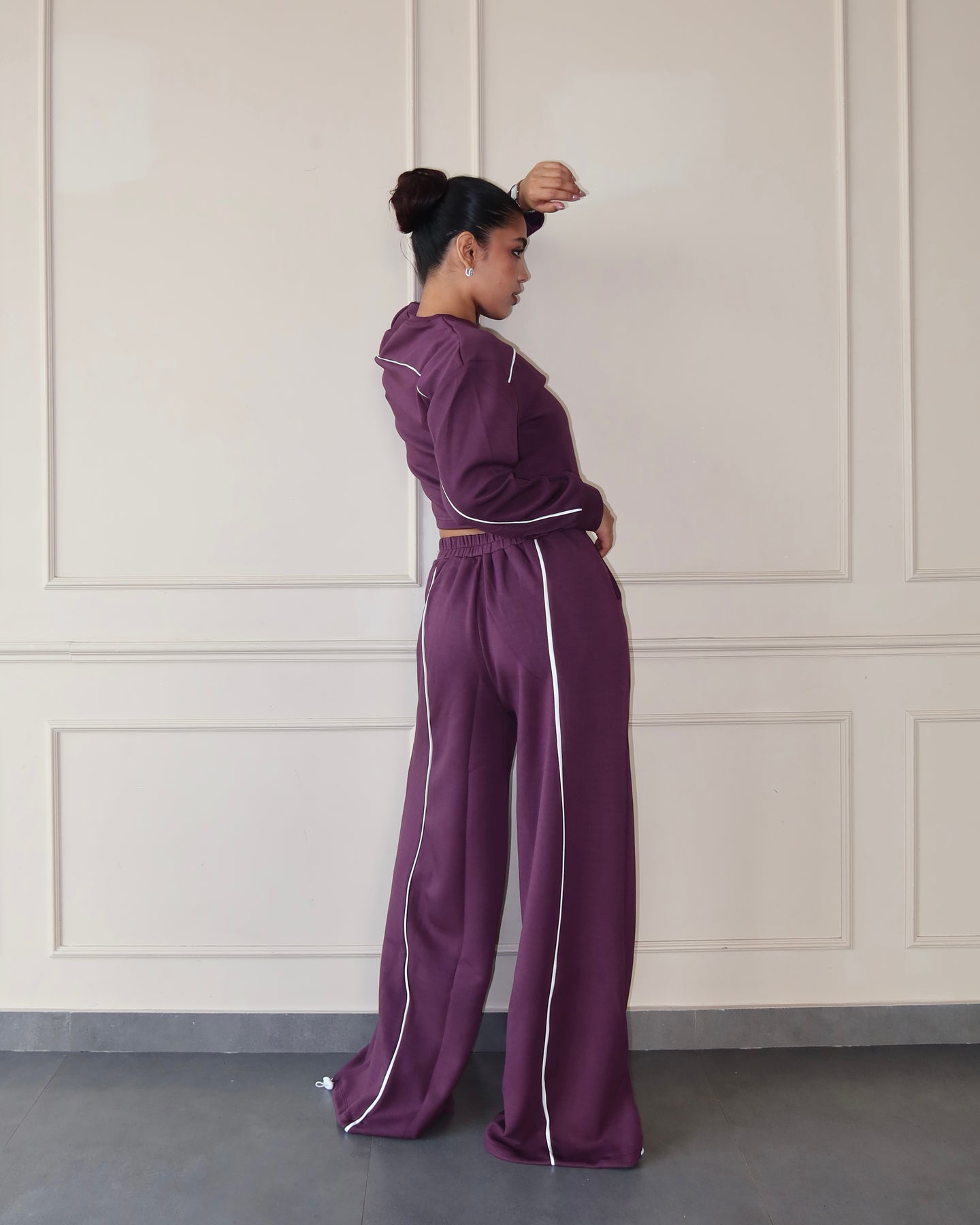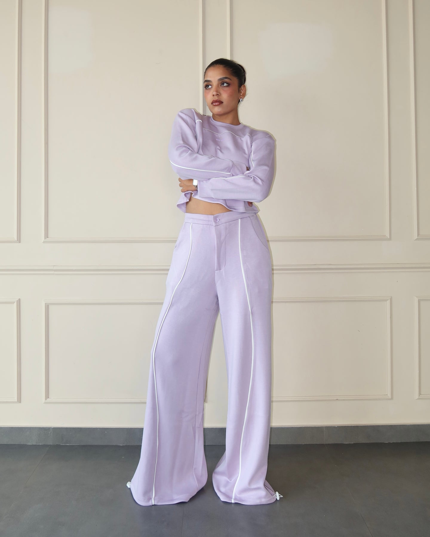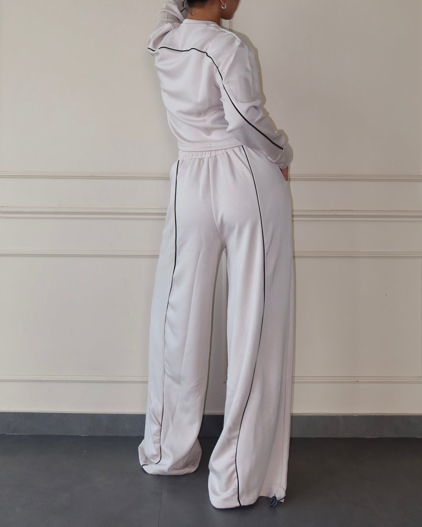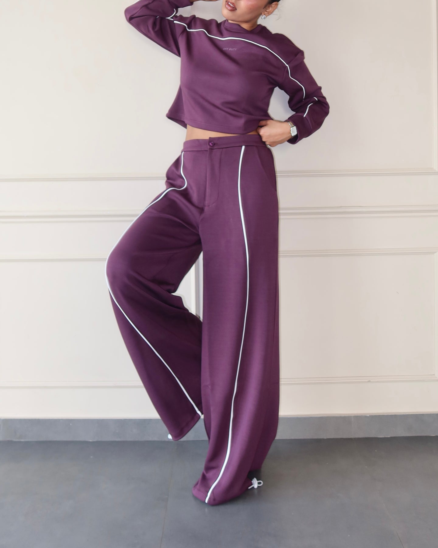 The wide-leg joggers feature cloud-contrast paneling, subtle piping, an elastic waistband, and adjustable drawstring hems for a customizable silhouette. The relaxed drop-shoulder sweatshirt mirrors the same sleek aesthetic with contrast piping and self-fabric neck and cuffs for a clean, minimal finish.
