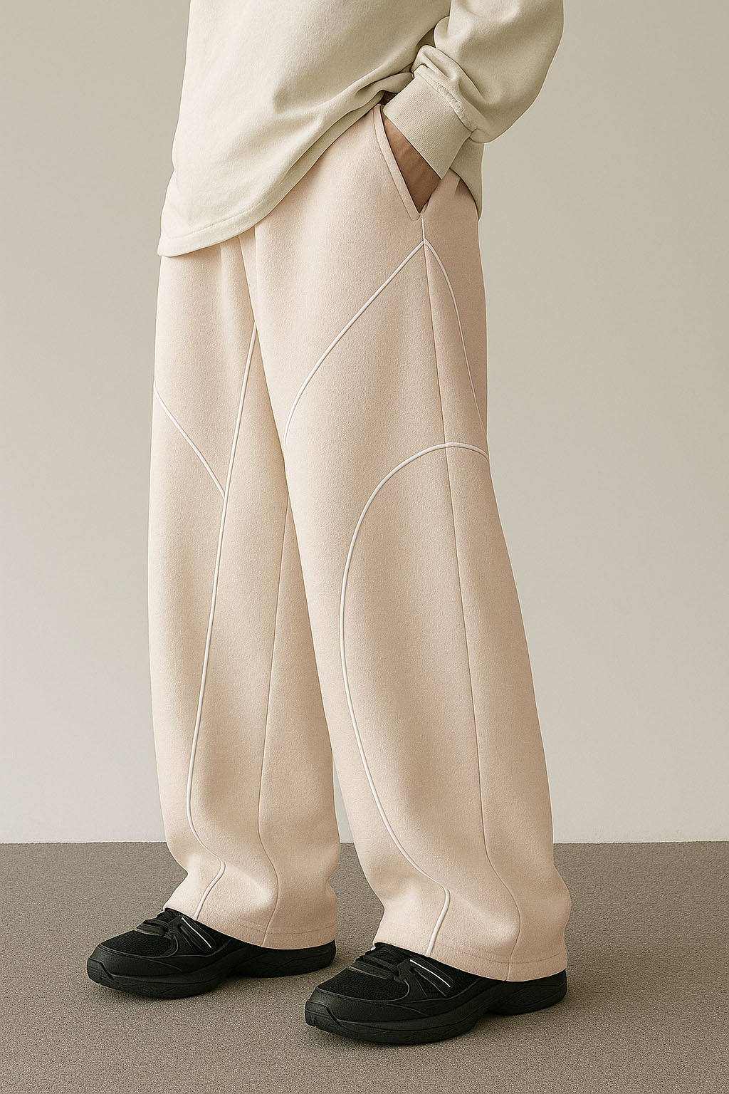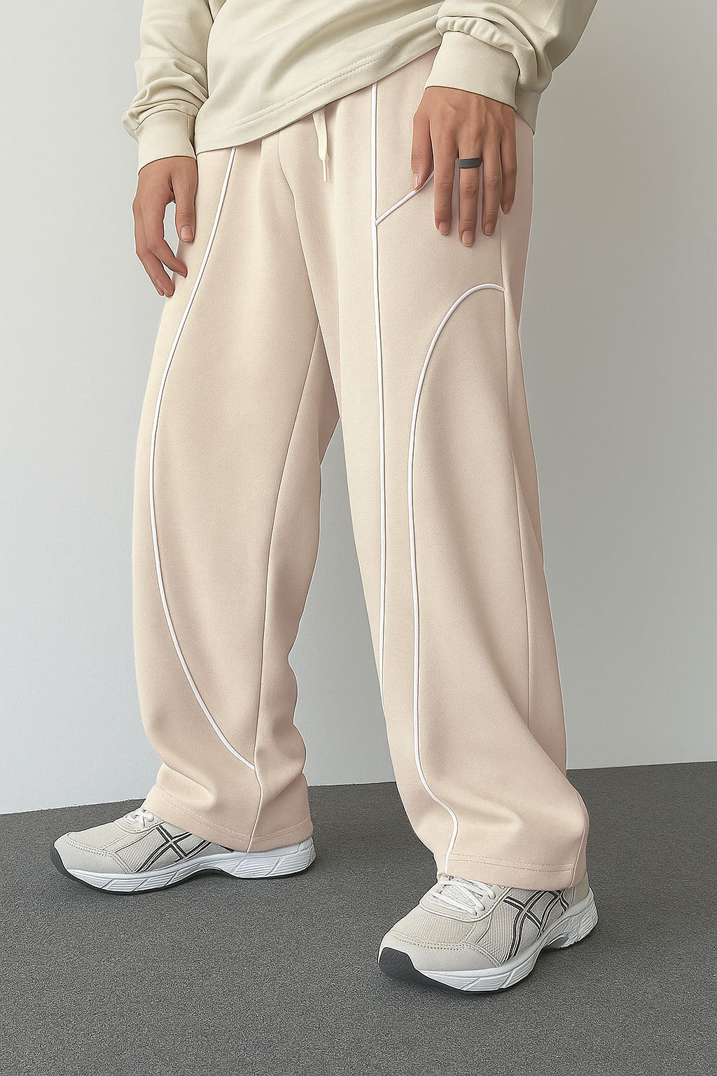 These Contrast Curve Baggy Joggers bring a fresh twist to everyday comfort with a roomy silhouette that flows with ease yet stands out with sculpted curve-panel detailing. Designed with a mid-rise fit and full-length drape, they blend streetwear volume with refined structure. The soft suiting fabric moves fluidly, giving the joggers a premium feel while maintaining that relaxed, unisex edge.