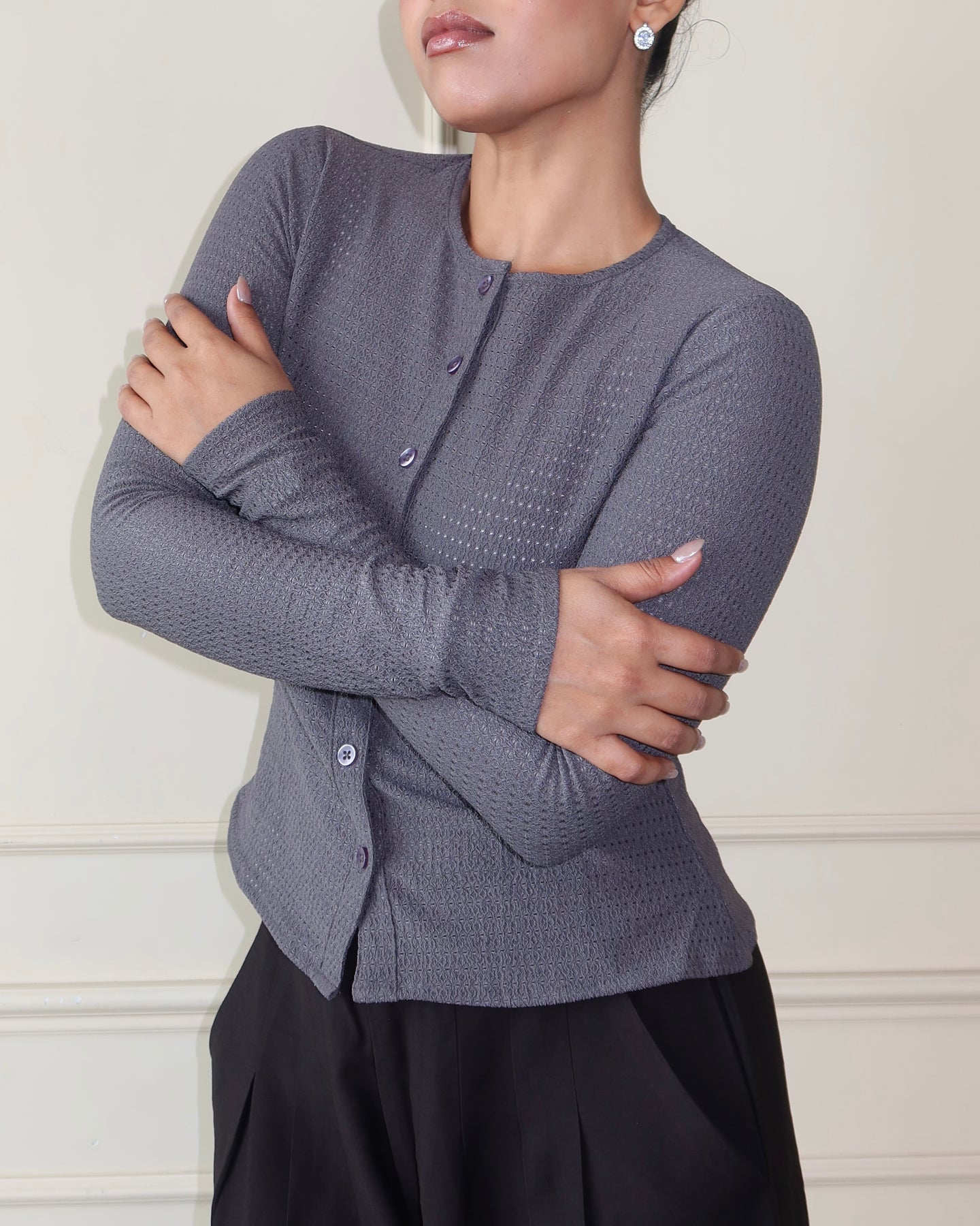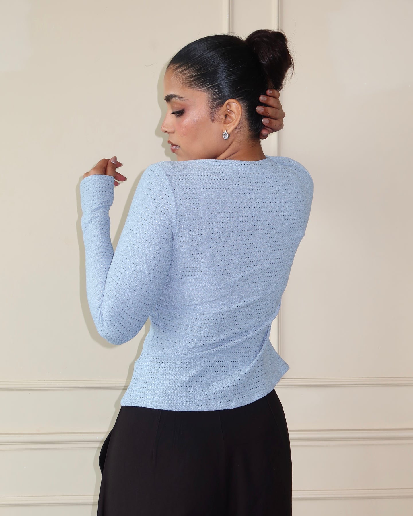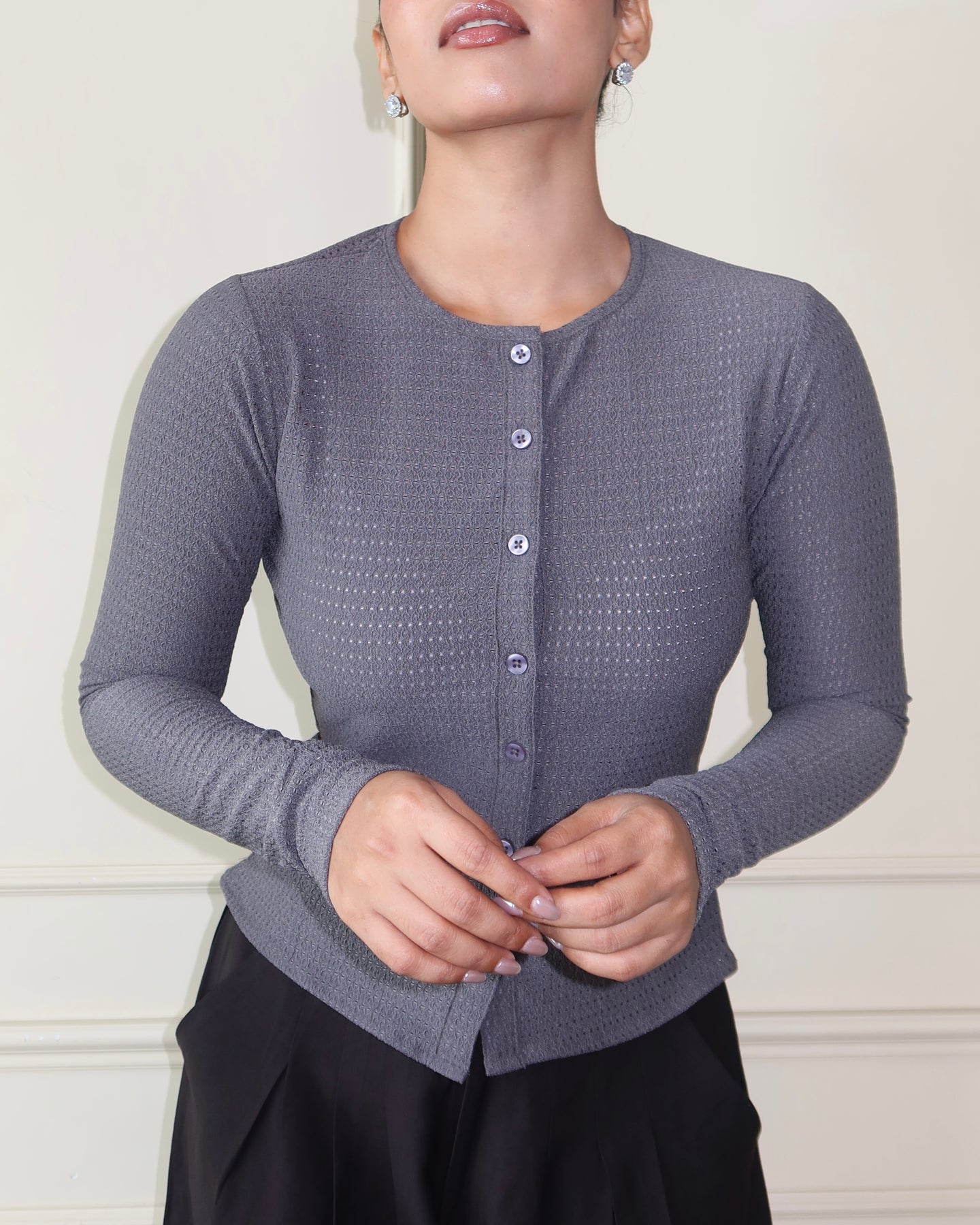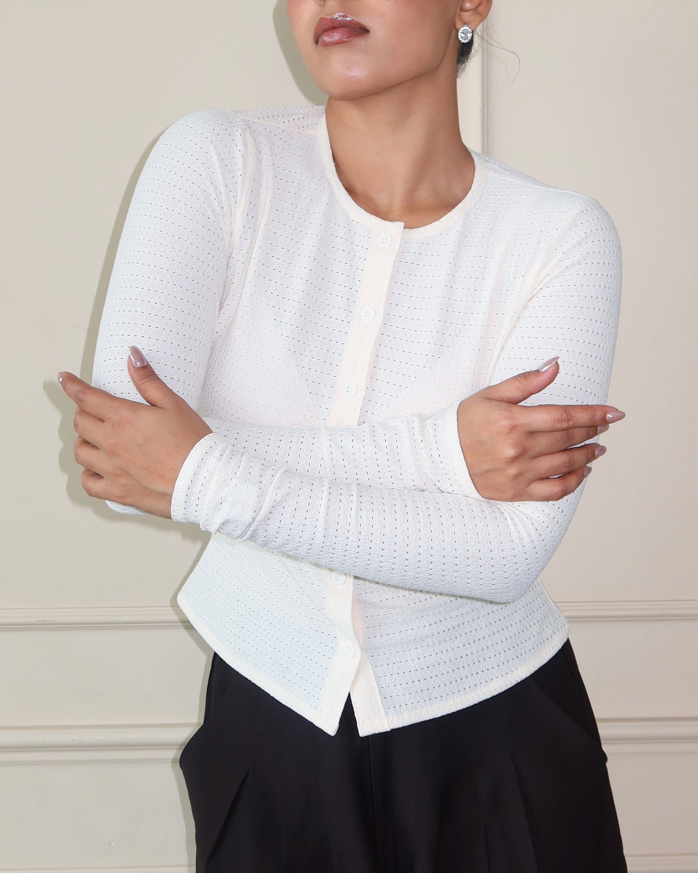 This full-sleeve fitted top is cut from Chikan Kari Jacquard Knit, balancing structure with stretch for a sleek, body-skimming fit. Featuring a clean button-front closure and subtle textural detailing, it blends everyday comfort with elevated design. The fabric’s flowy drape and refined surface interest make it versatile enough to wear solo or layered, effortlessly moving between day and night.