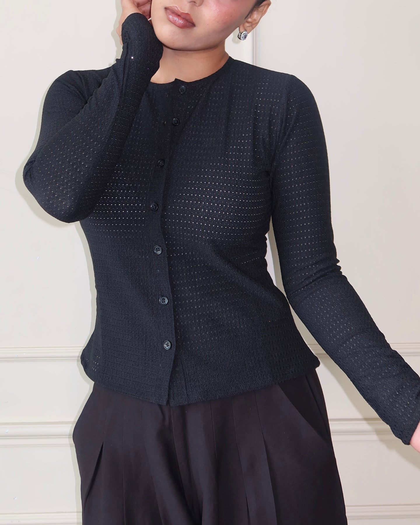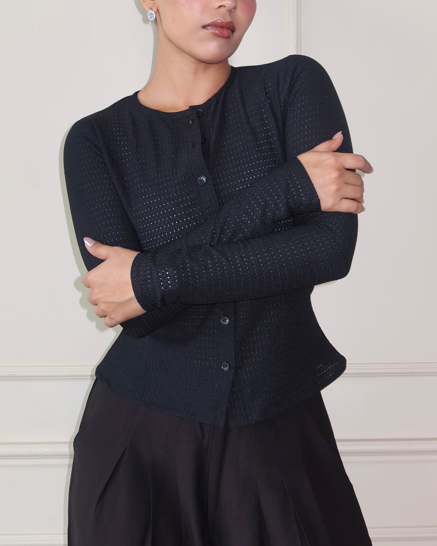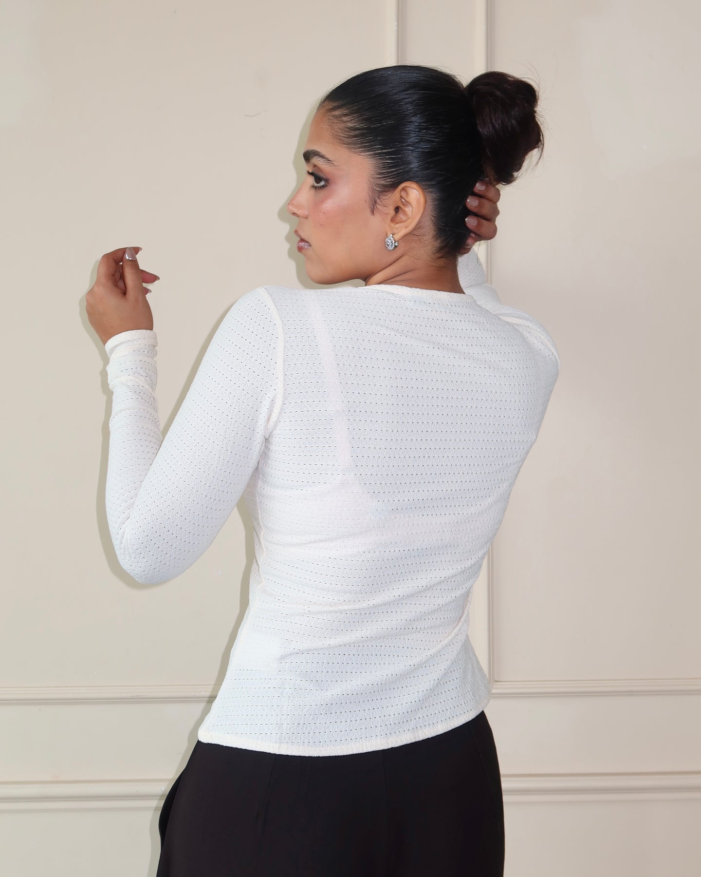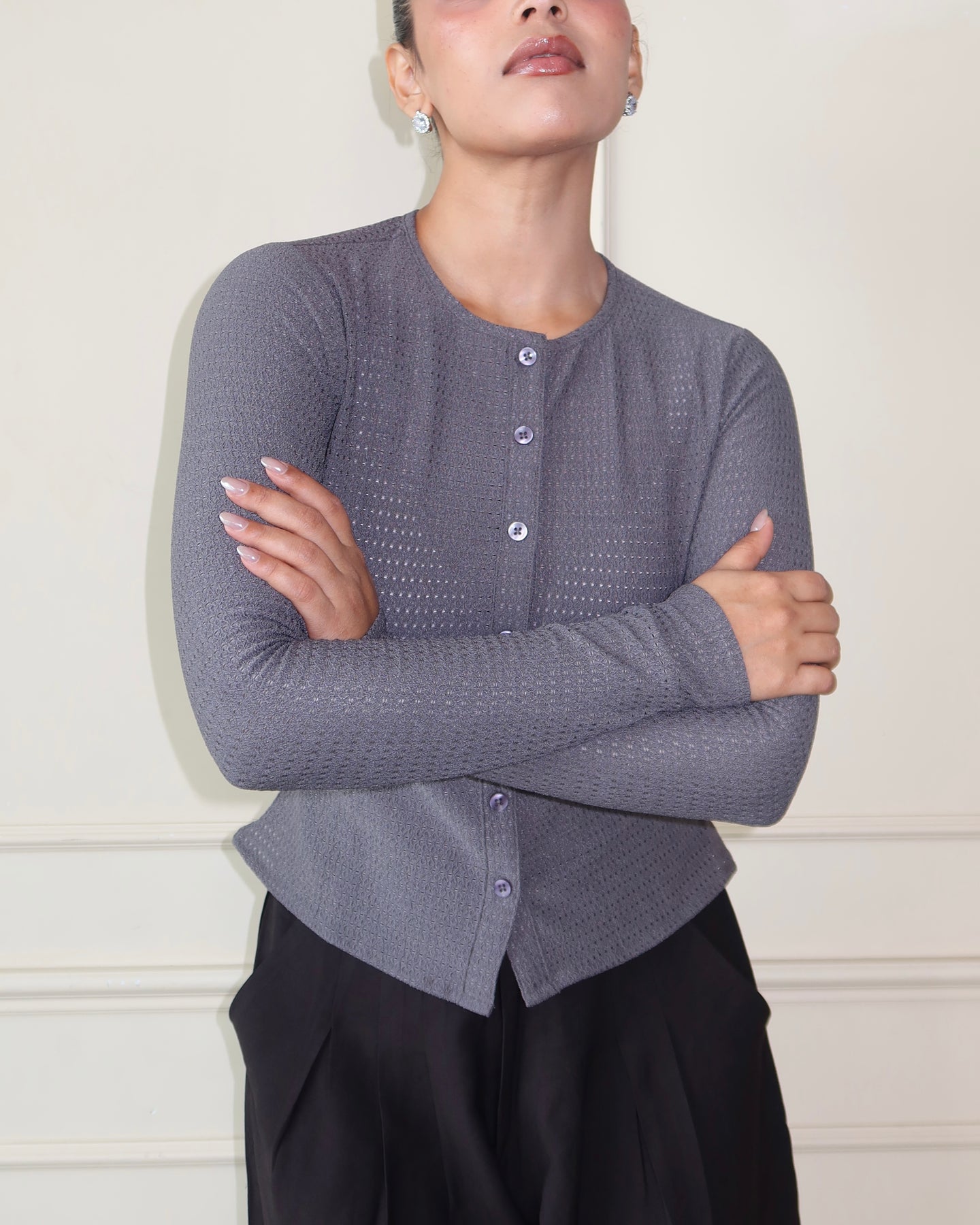 This full-sleeve fitted top is cut from Chikan Kari Jacquard Knit, balancing structure with stretch for a sleek, body-skimming fit. Featuring a clean button-front closure and subtle textural detailing, it blends everyday comfort with elevated design. The fabric’s flowy drape and refined surface interest make it versatile enough to wear solo or layered, effortlessly moving between day and night.