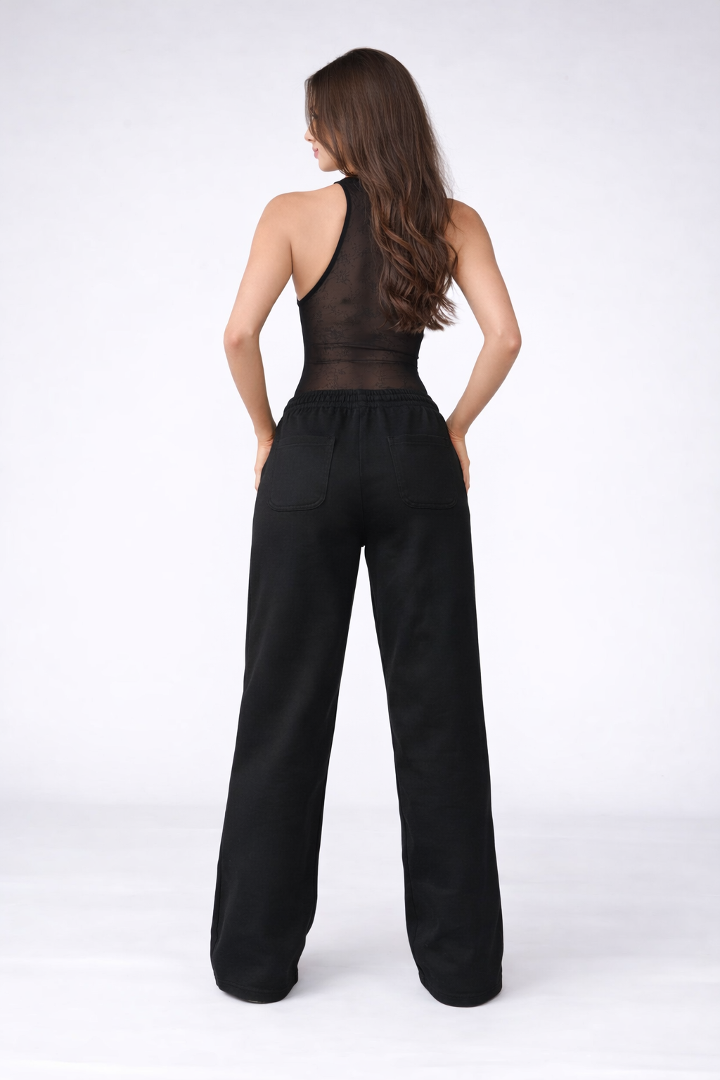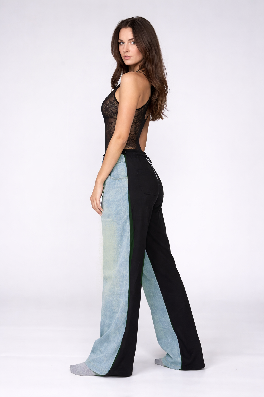 Details: Boxer-style elastic waistband, contrast side panels with piping, relaxed wide leg, soft all-over fading, clean hem finish