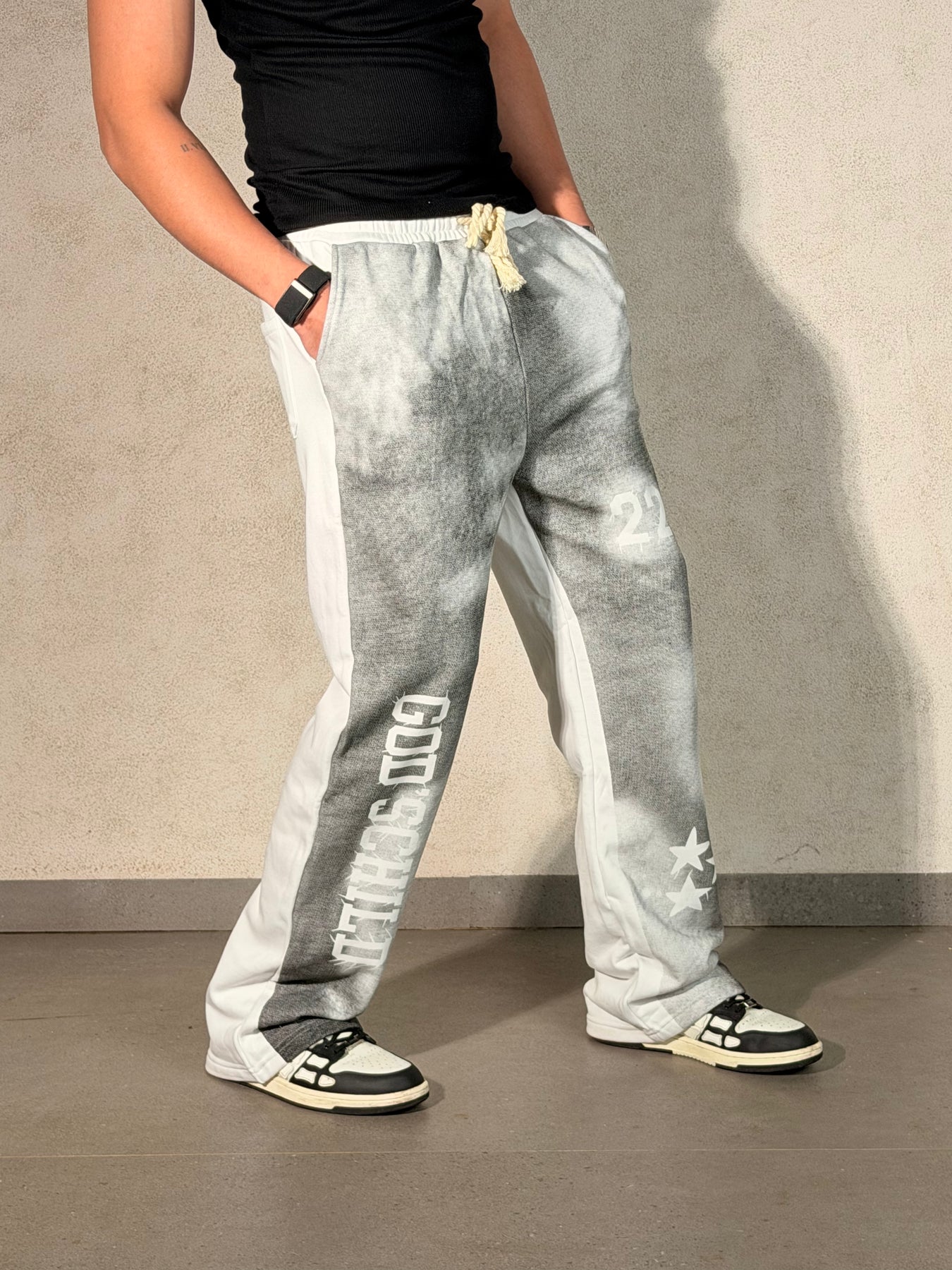 These street-style joggers stand out with a bold dual-tone design featuring a washed grey front panel contrasted by solid black sides. Finished with graphic “GOD’S CHILD” lettering and a sporty “22” print, they blend urban attitude with a relaxed, easy-wear fit.