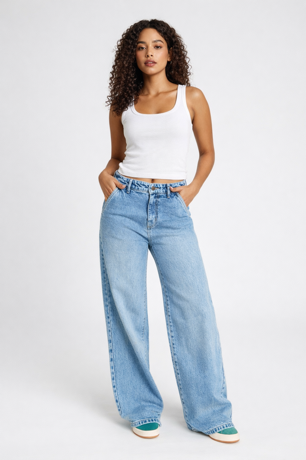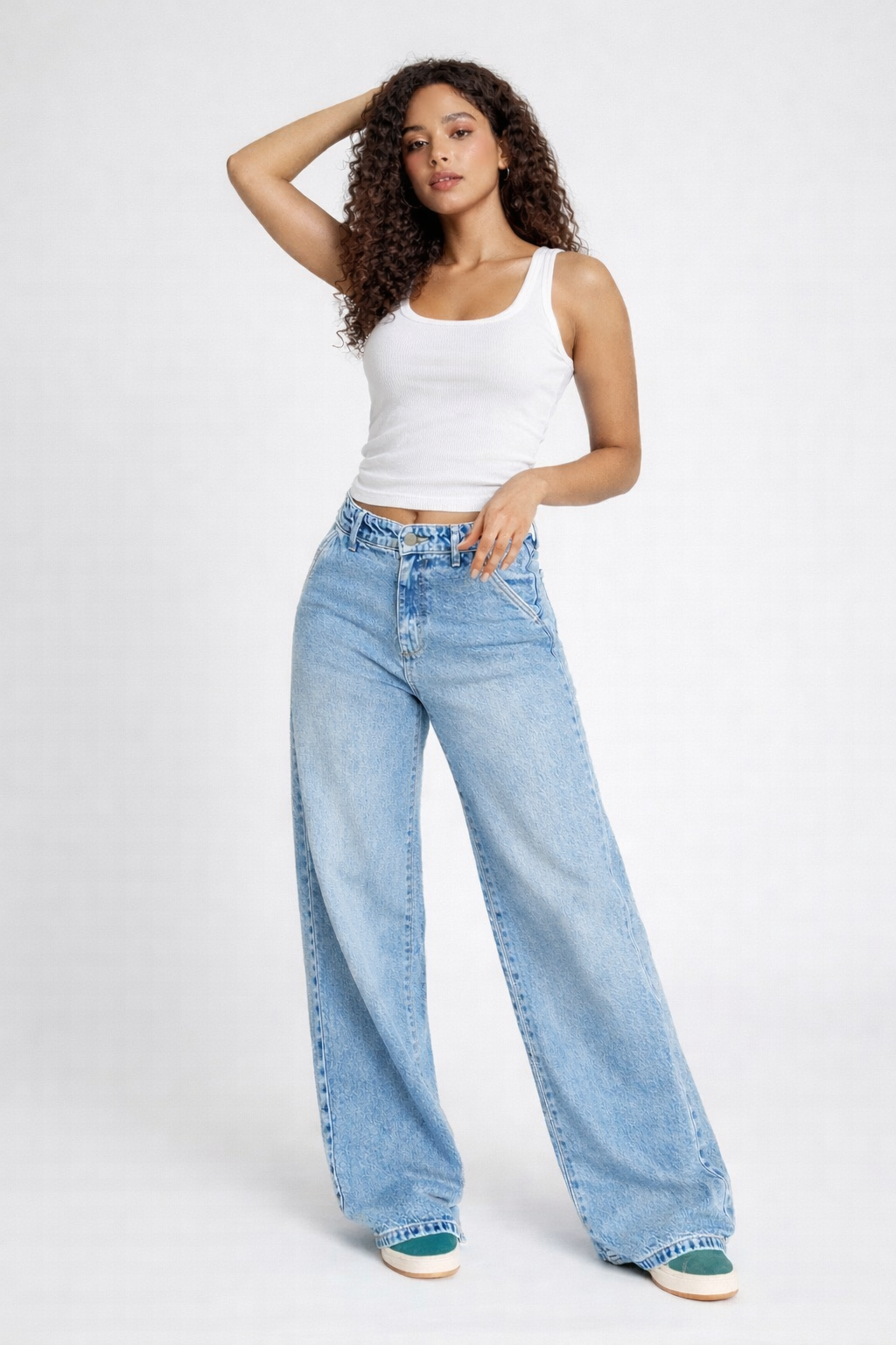 Style: High-waist, wide-leg jeans