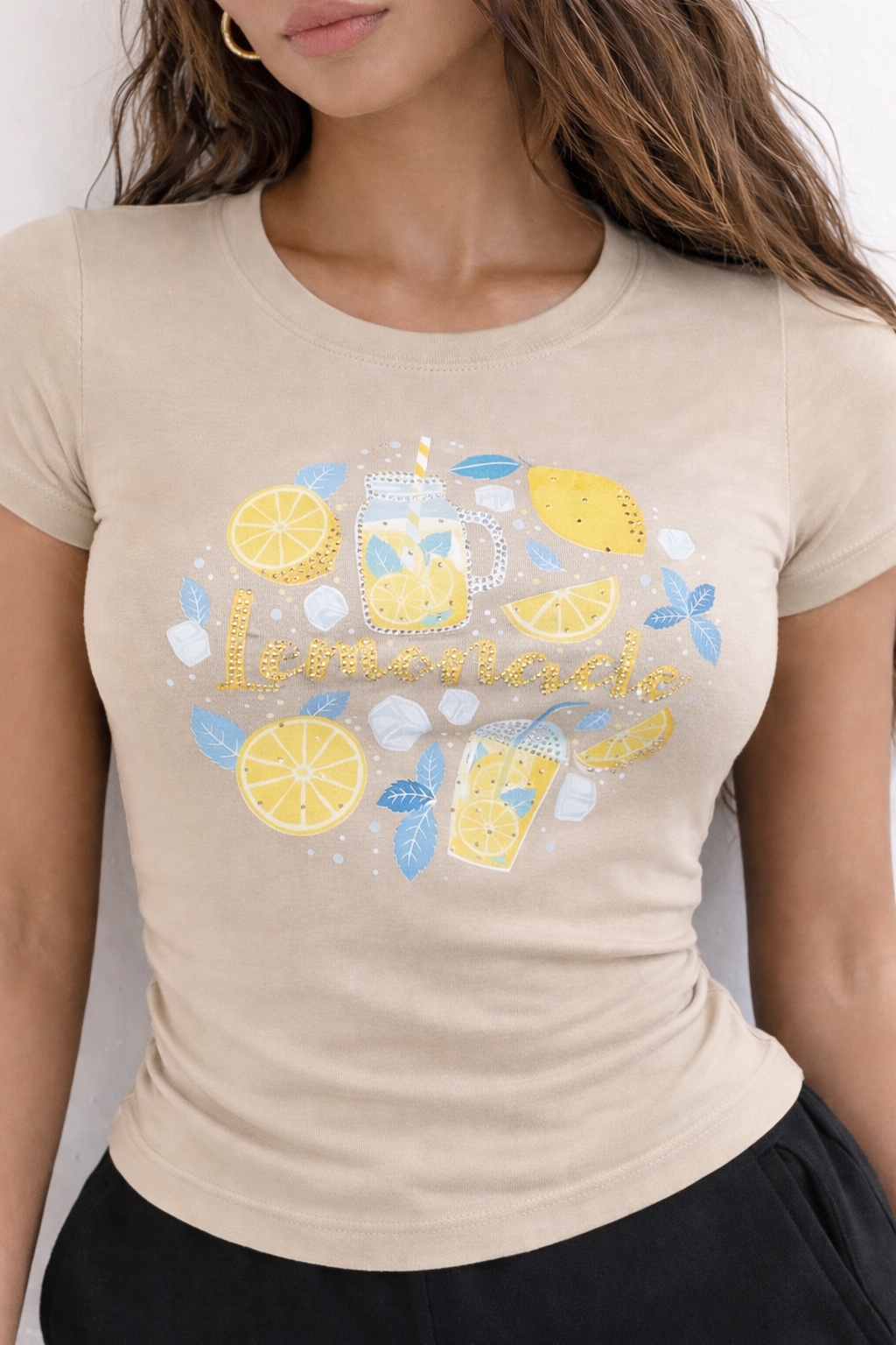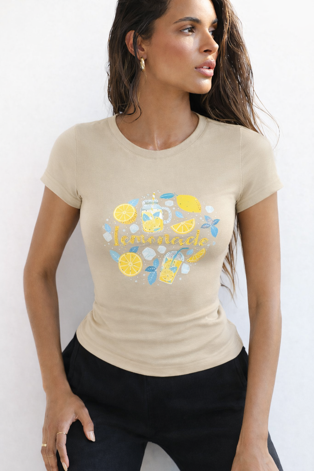 Details: Lemonade-themed front graphic, crew neckline, short sleeves, cropped body-hugging fit, soft stretch fabric, bright casual silhouette