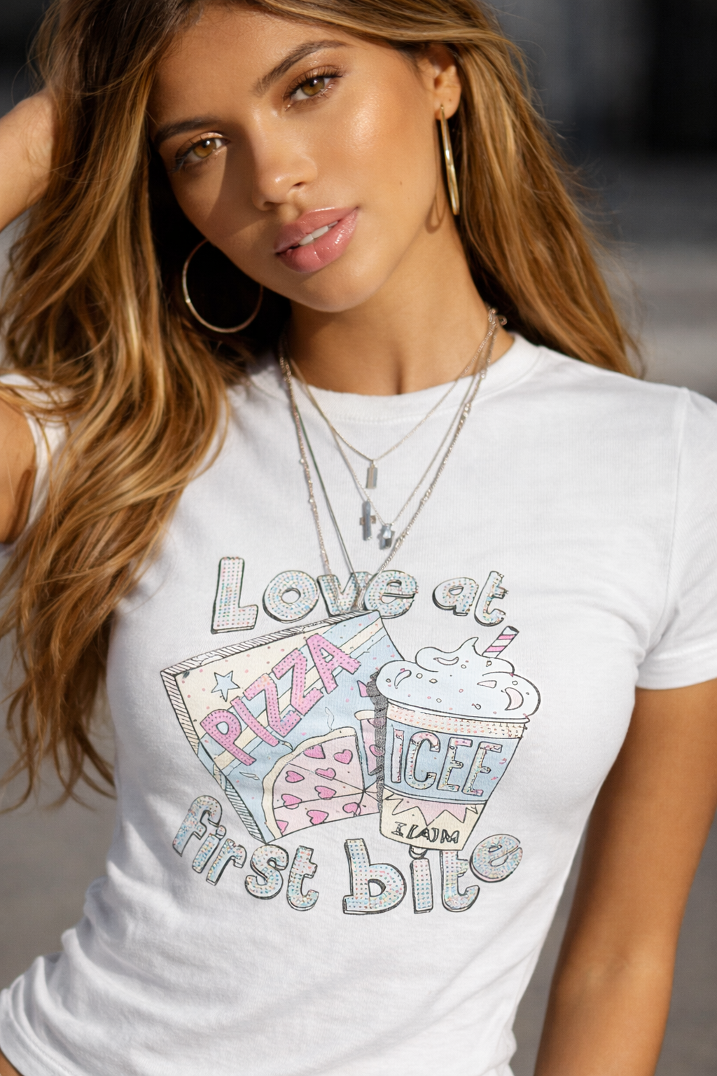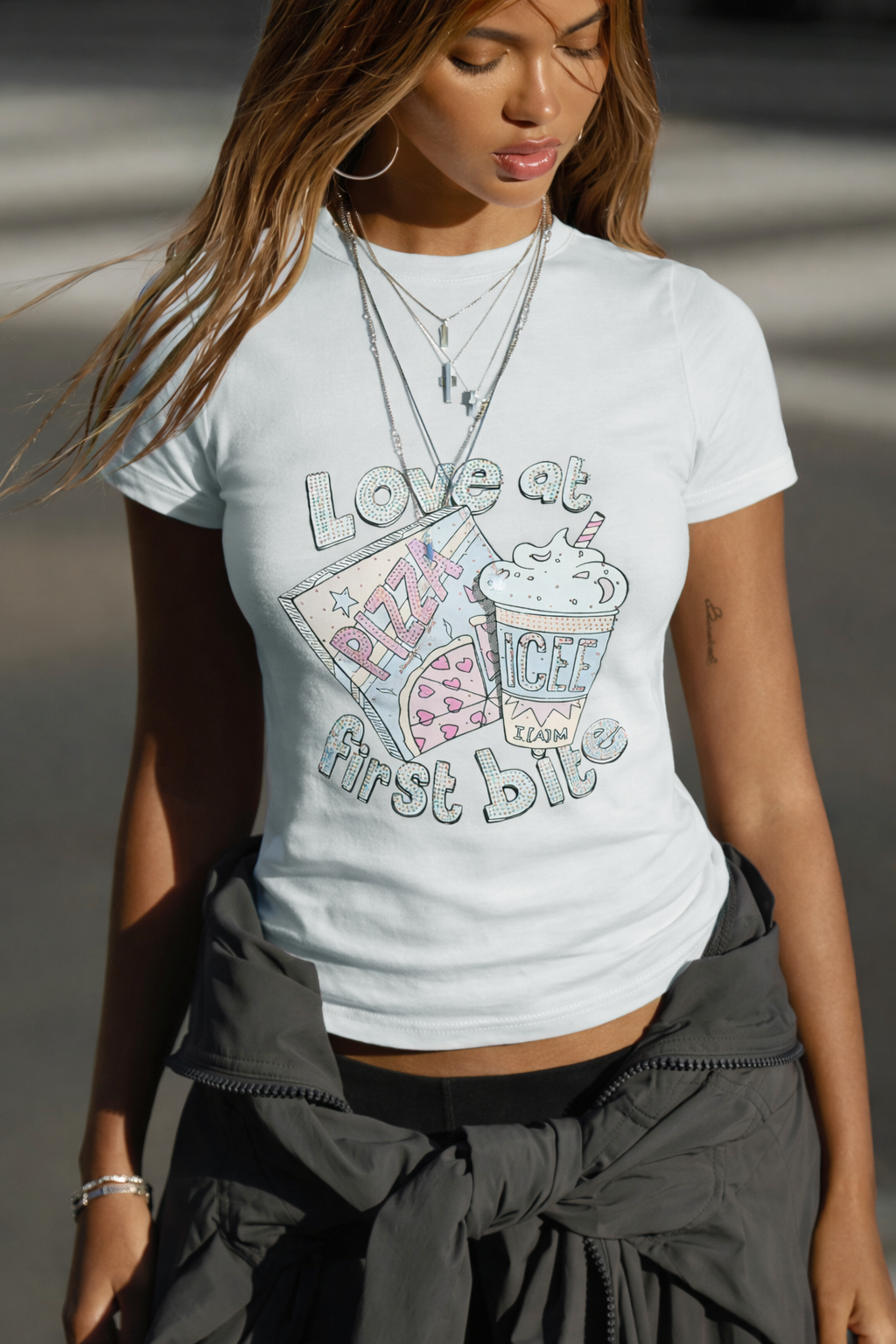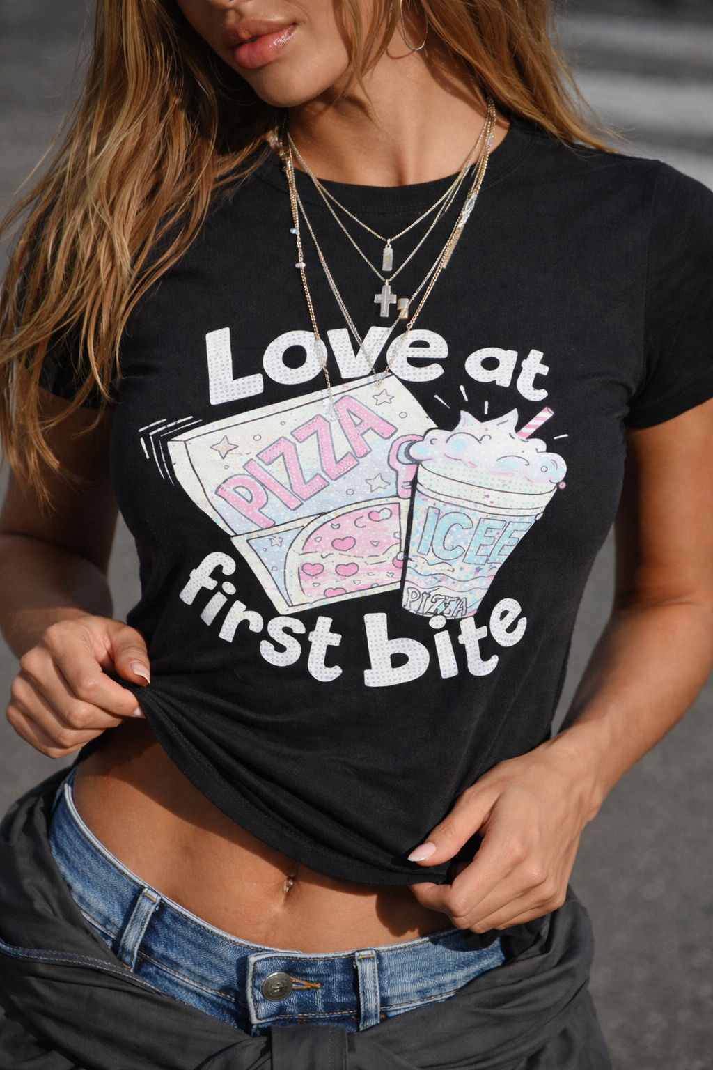 A cute graphic essential with major Y2K energy, this baby tee features a playful “Love at first bite” print with pizza-and-soda artwork for a fun, foodie-inspired vibe. Designed with a snug, slightly cropped fit and a classic crew neckline, it’s an easy go-to for styling with denim, cargos, or mini skirts.