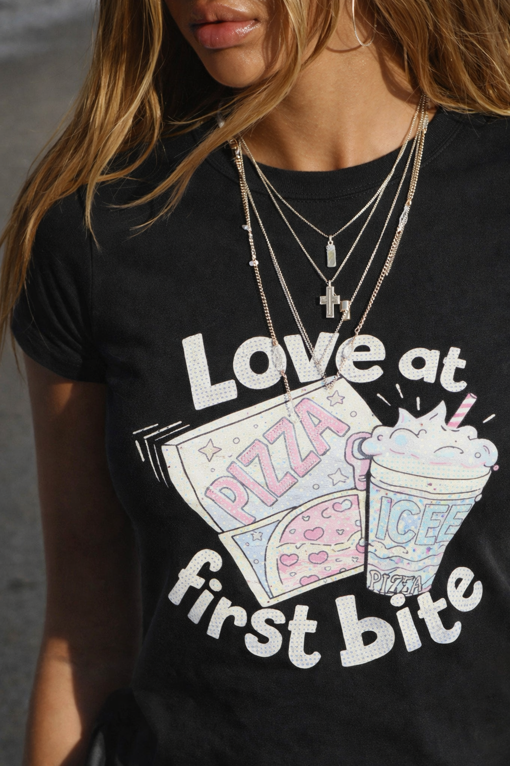 Details: “Love at first bite” front graphic, pizza & soda artwork, crew neckline, short sleeves, cropped body-hugging fit, soft stretch fabric, casual everyday silhouette