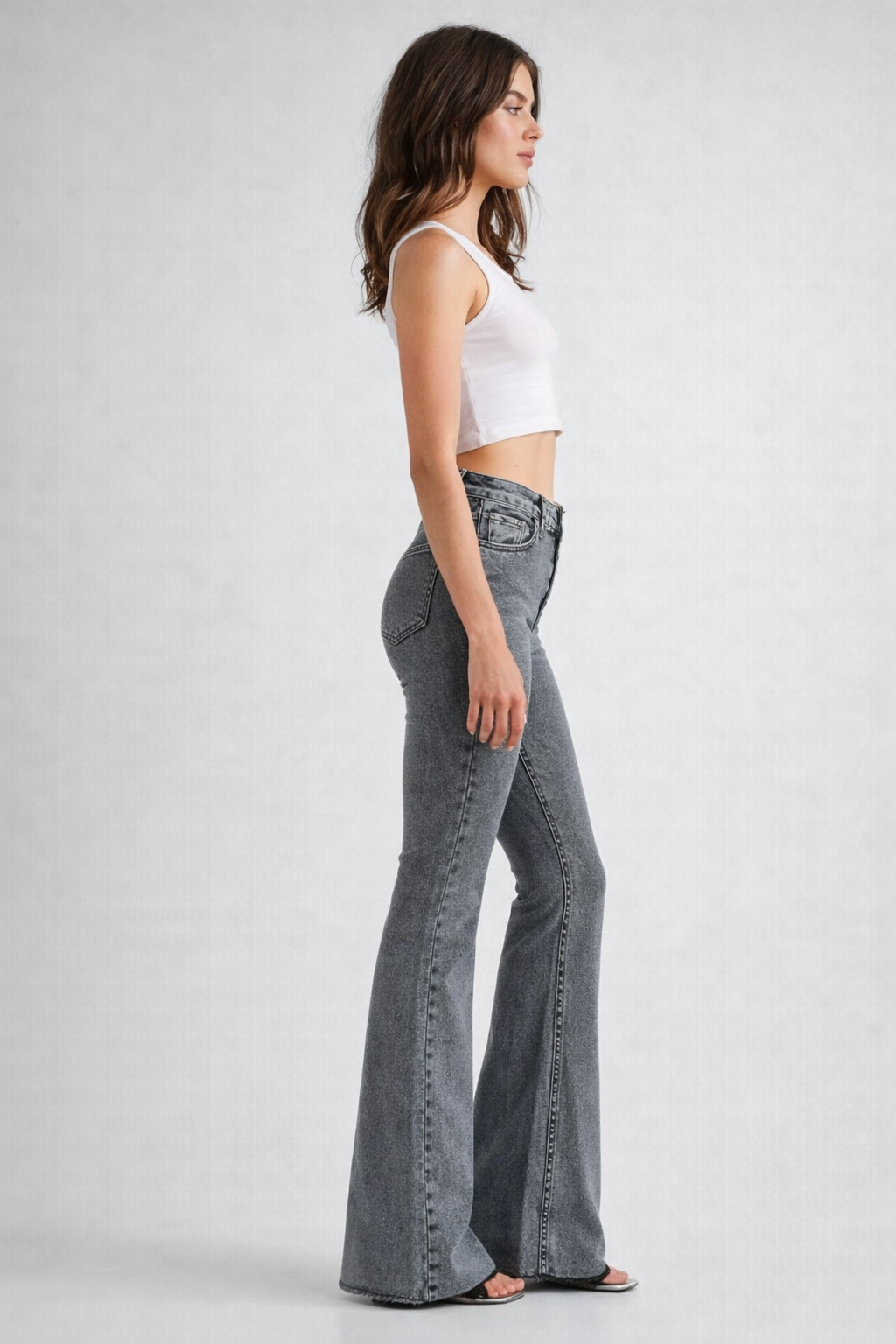 The Neutral Grey Bootleg High Rise Jeans blend '90s nostalgia with modern tailoring. Designed to contour at the waist and flare subtly below the knee, the bootcut silhouette gives your legs a longer, leaner look.