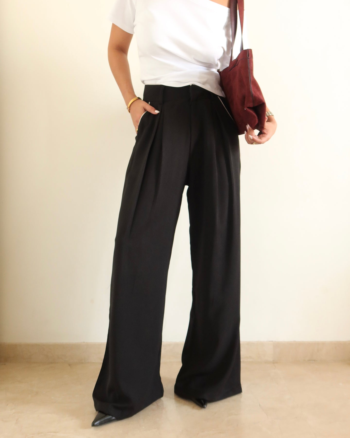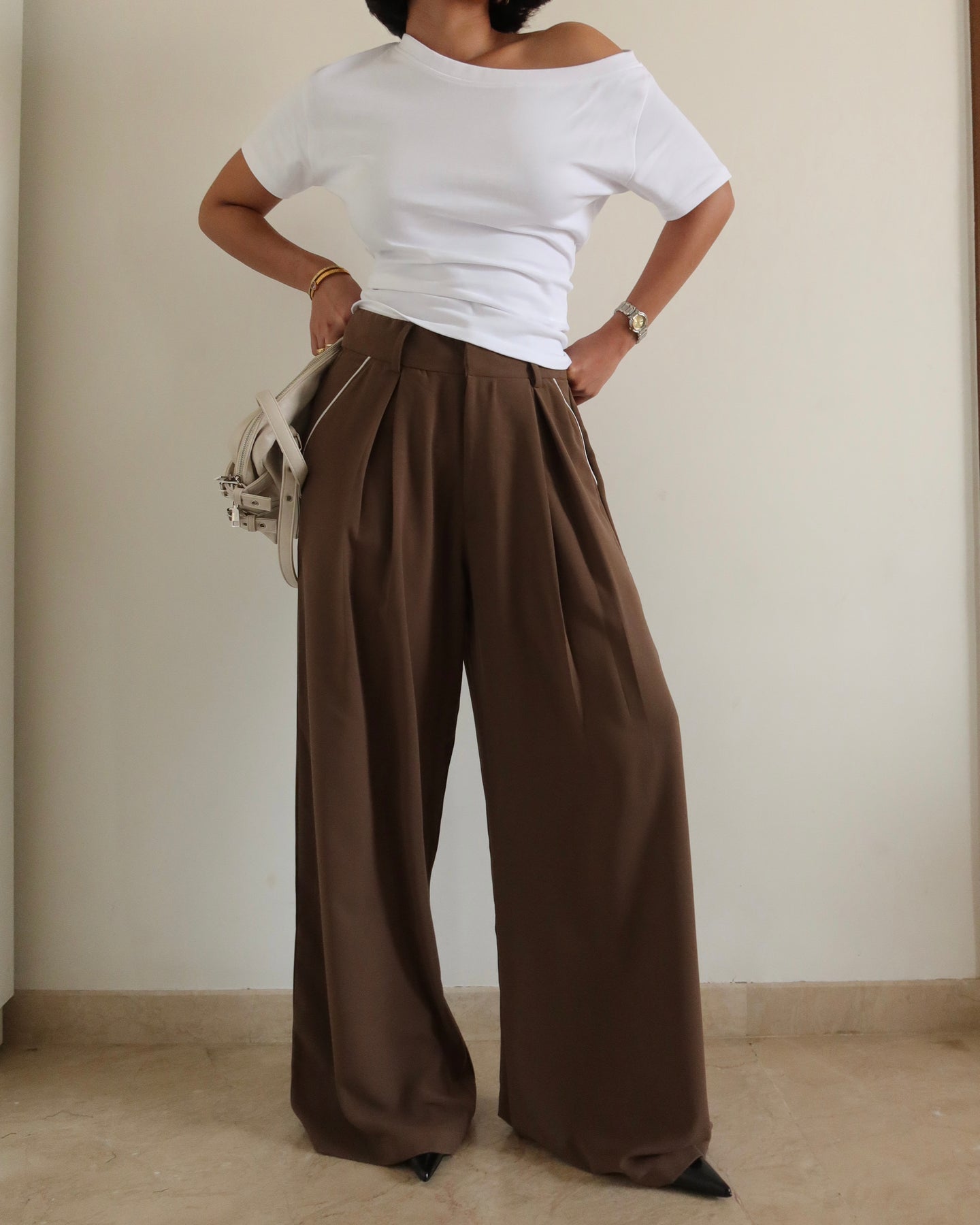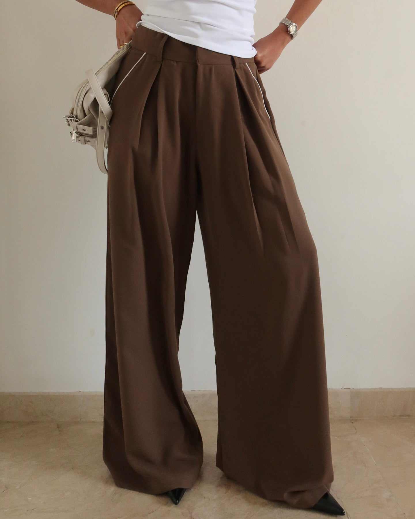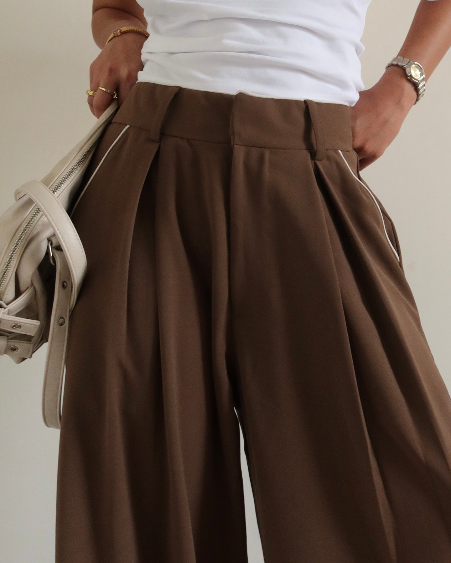 The Outline Pleats Pants — Women blend refined tailoring with modern minimalism. Designed with clean front pleats and contrast piping, they offer a sophisticated yet understated statement.
