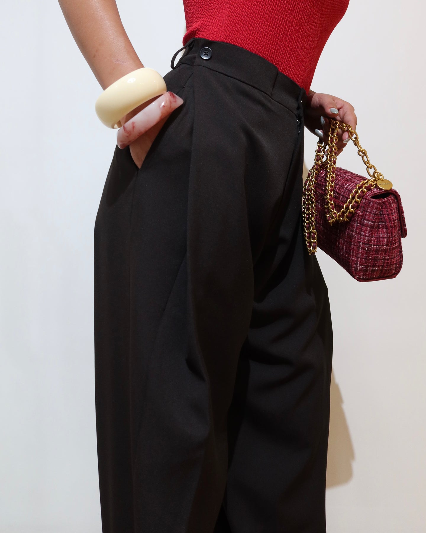 Thoughtfully placed pleats add depth and dimension, while the signature side button detailing brings a refined, contemporary touch. The mild stretch construction ensures flexibility and ease, maintaining a polished wide-leg profile throughout the day.
