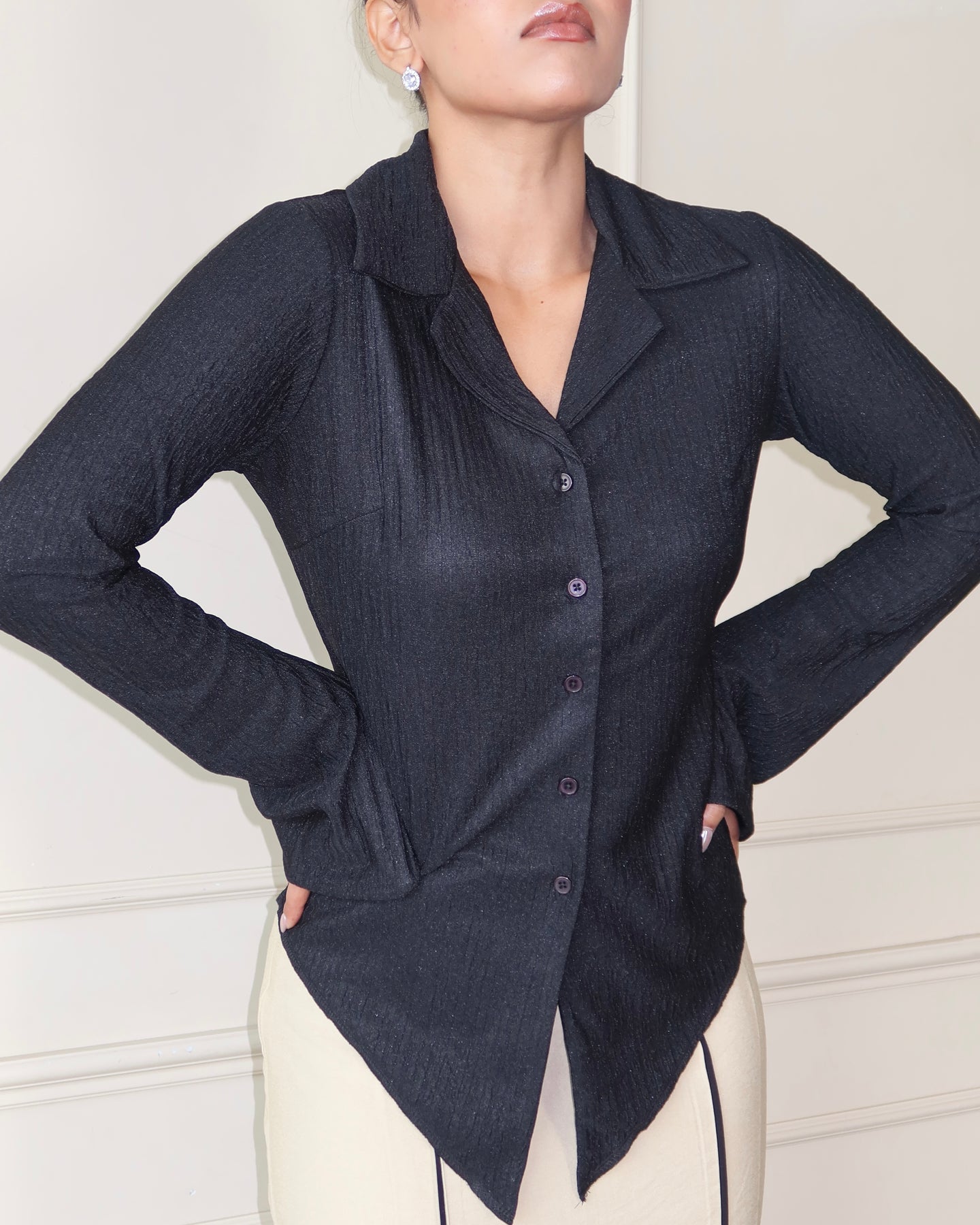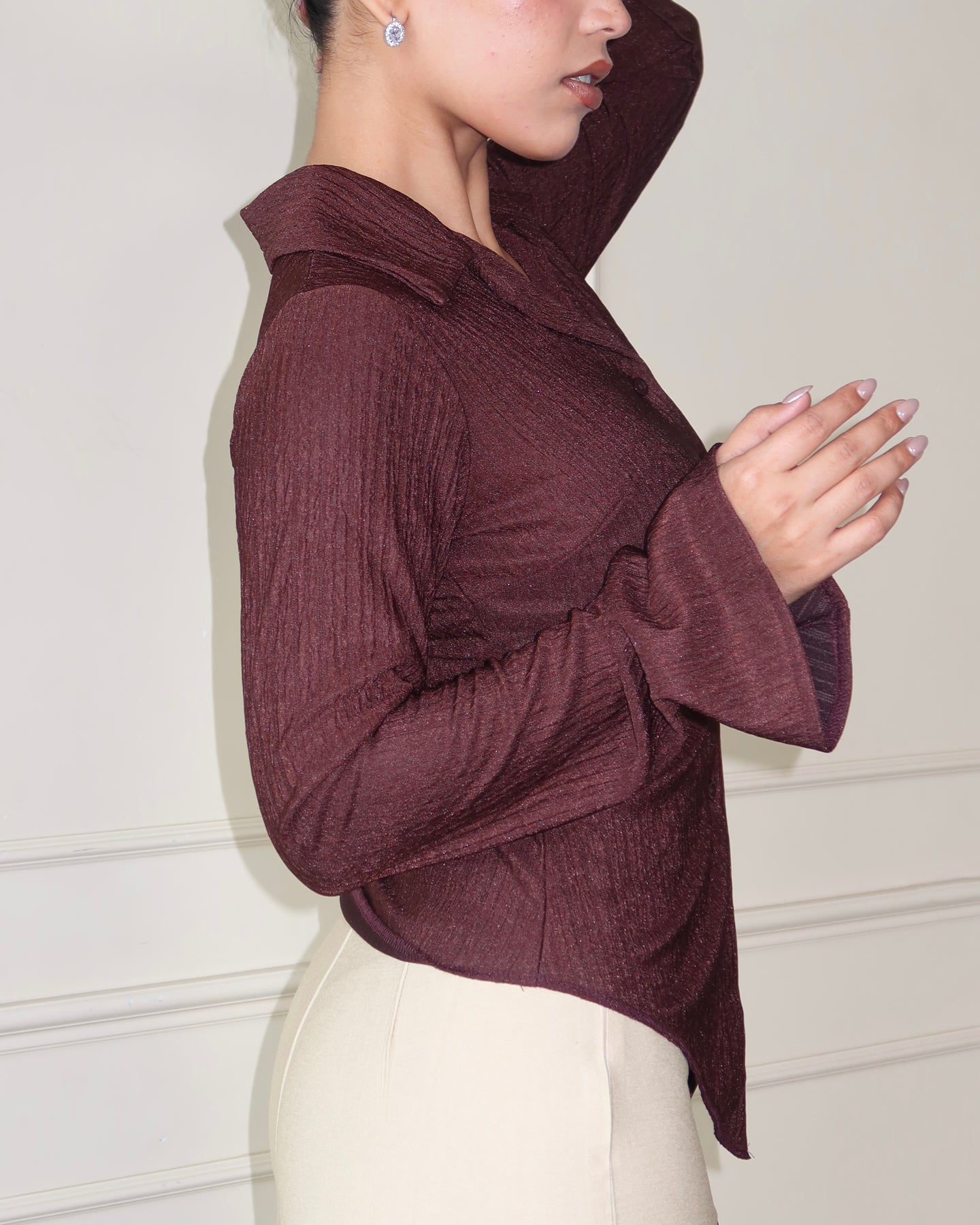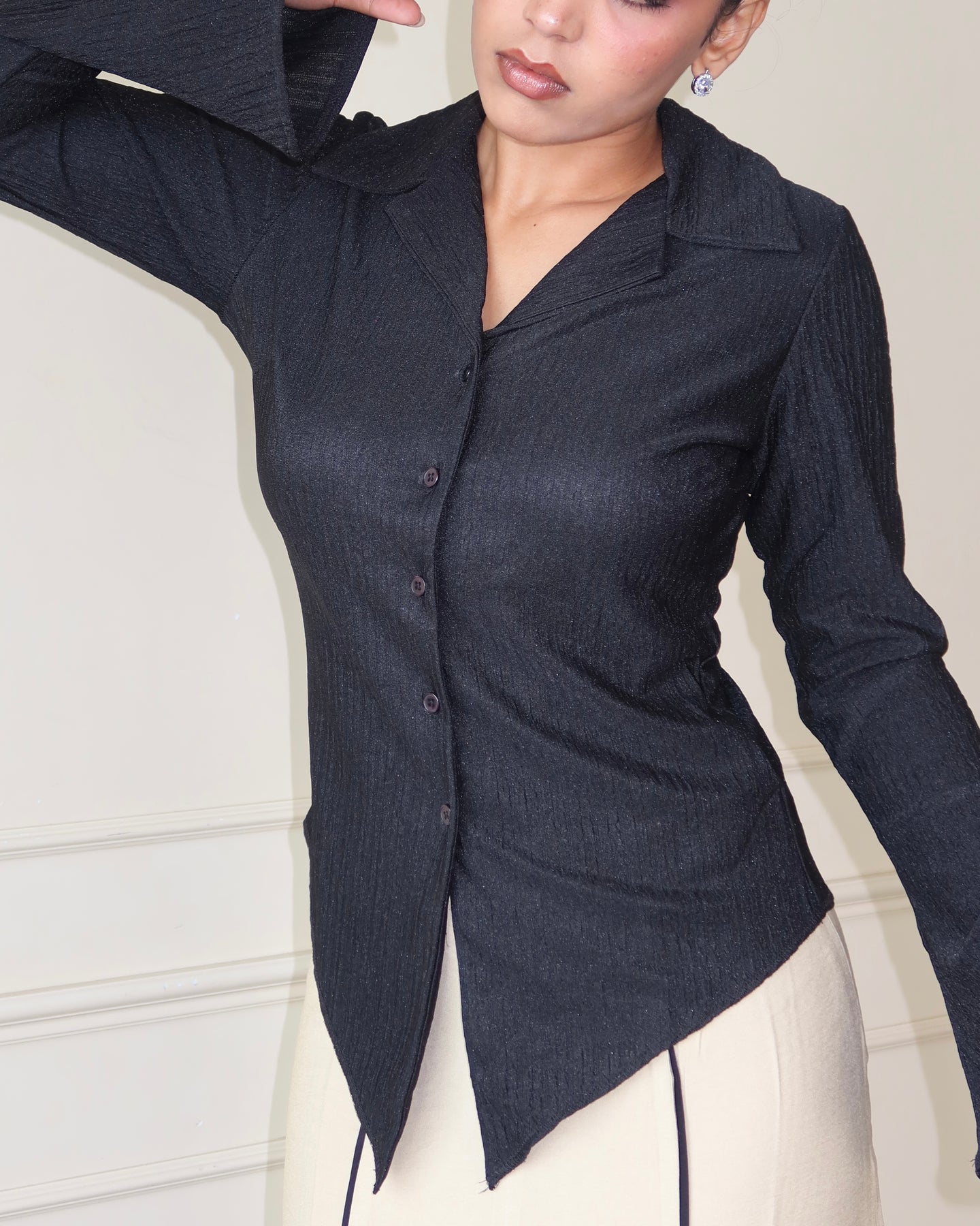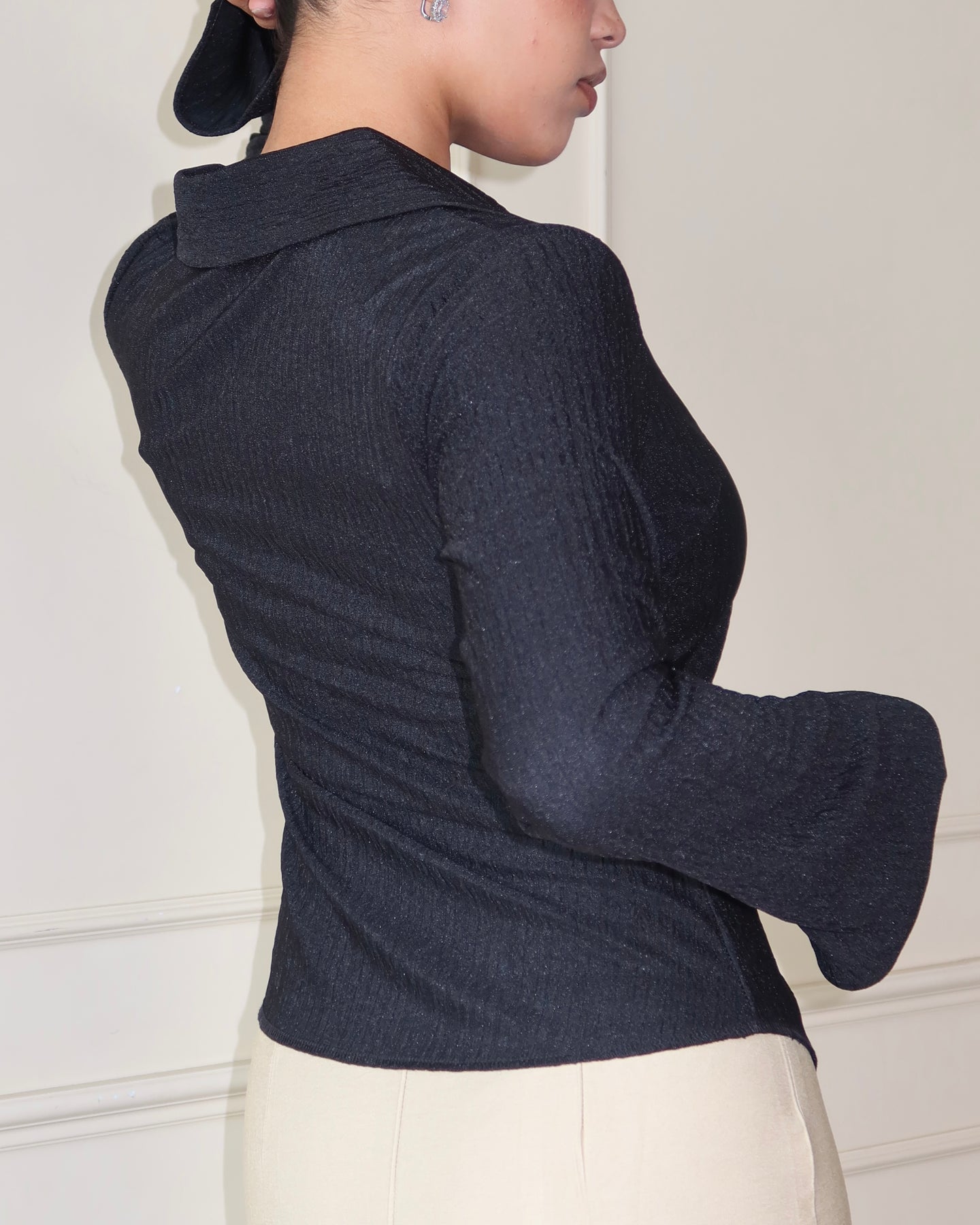 This bell-sleeve button-down top brings tailored precision with just the right touch of stretch. Designed with a sharp collared neckline and button-front closure, it merges crisp structure with fluid ease. The crinkled texture adds refined depth, while the retro-inspired bell sleeves create a statement silhouette that feels both modern and timeless.