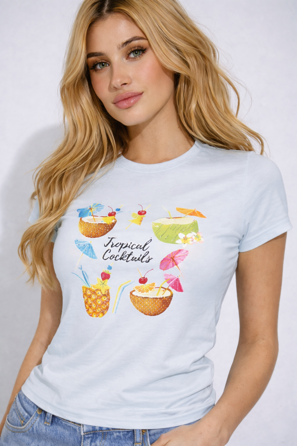 A fun vacation-core staple, this baby tee features a colorful “Tropical Cocktails” graphic with fruity drink illustrations for a fresh, summery vibe. Designed with a snug, slightly cropped fit and a classic crew neckline, it’s perfect for pairing with denim shorts, low-rise jeans, or a mini skirt.