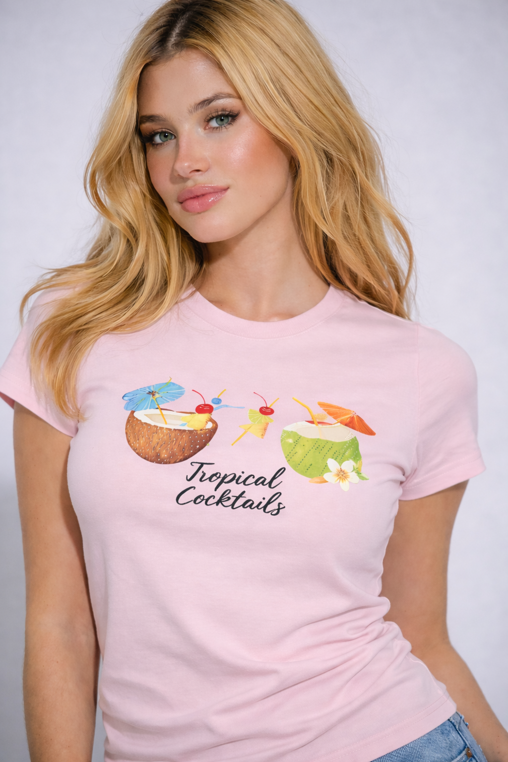 Details: “Tropical Cocktails” front graphic, multicolor drink illustrations, crew neckline, short sleeves, cropped body-hugging fit, soft stretch fabric, playful casual silhouette