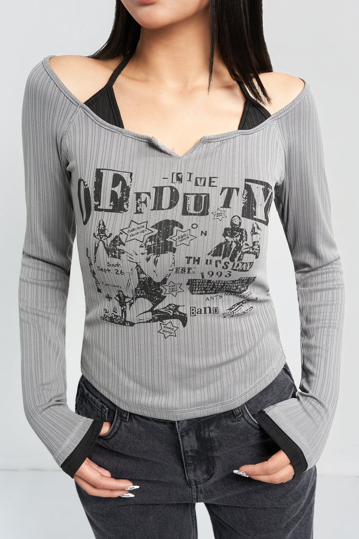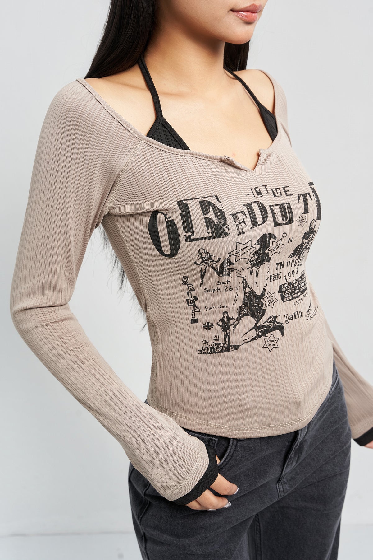 This top blends full-sleeve comfort with a Y2K-inspired halter tie-up detail, giving it a unique layered look. Designed with a bold Off Duty front graphic, it brings together sporty, feminine, and retro elements in one standout piece — perfect for everyday styling with a streetwear edge.